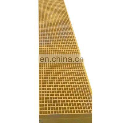 Product Description Resist Liquid Corrosion High Quality Fiberglass Floor Grating FRP Grating Trench Covers FRP Grating Trench Covers have a wide range of applications, like the pot-room of chemical plant and smelting plant, chemical processing workshop of power plant, pickling workshop of electroplating factory, battery factory and machinery plant, pharmaceutical factory, printing and dyeing mill and salt mine all have a lot of trenches, and there are always corrosive liquid in the trenches. Traditional trenches use gratings welded from angle steels, flat irons and cast irons, which are not corrosion resistant, and they would be destroyed after a few years even few months. Using FRP gratings can solve the corrosion problem well, and FRP gratings are convenient for the sewage spilling into the ditches, as well as observing the inner trench at any time.Using FRP gratings as the trench covers could let you observe the inner trench clearly.The FRP gratings' most significant feature is corrosion resistant, so they won't be corroded by waste water.The FRP gratings used in carwash rooms can help drain away the dirty water, so as to keep the room clean.FRP gratings for covering the ground around the roots of trees can help prevent the evaporation of water.SpecificationResin SystemsResin type Resin Base Description Corrosion Resistance Flame Spread Rating A STM E84Available color Max.order TempVEFR-20Vinyl Ester superior corrosion resistance and fire retardant Excellent Class1, 20 or less Yellow, green, white , black, blue, orange 230oFIFR-25Isophthalic polyesterIndustrial Grade Corrosion Resistance and fire retardant very good Class1,25 or less Dark Gray, green 221oFFG-20Isophthalic polyesterFood grade corrosion resistance and fire retardant Very good Class 1, 20 or less Light gray, light green 221oFCFR-25Orthophthalic polyesterModerate corrosion resistance and fire retardant Moderate Class1,5 or less Green yellow light gray drak gray212oFMP-5PhenolicLow smoke and superior fire resistance very good Class 1,10 or less Reddish-brown356oFIFR-10Isophthalic polyesterIndustrial Grade Corrosion Resistance and Extra fire retardant very good Class 1,10 or lesscustom 221oFType VEFR-20 is a premium vinyl ester resin with a flame spread rating of 20 or less. Type VEFR-25 resin provides the mostchemical resistance in the industry, designed to withstand the harshest chemical environments over a broad range of acids and caustics, it is primarily used in petrochemical, waste water, mining,and plating applications where the grating is subject to frequent and direct contact with harsh chemicals.Type IFR-25 is a premium isophthalic polyester resin with a flame spread rating of 25 or less. Type IFR-25 provides anintermediate level of chemical resistance and is the correct resin choice for grating subjected to splash and spill contact with harsh chemicals, and is a very good general purpose resin at a reduced cost compared to the premium vinyl ester resin. Type FG-20 is manufactured using a premium food grade polyester resin containing no harmful ingredients and is certified by the resin manufacturer. Each panel is post cured and detergent washed prior to shipment. This grating possesses a flame spread rating of 20.Type CFR-25 is an orthophthalic polyester resin with a flame spread rating of 25 or less providing moderate chemical resistance. This grating is perfect for use in water/wastewater applications, light industrial applications, and in the wavezone areas of offshore platforms where the environment is moderate. Although Type CFR-25 is the least chemical resistant resin, it still offers superior performance to traditional flooring products such as steel, aluminum and wood, and is the most economical resin available.Type O-AN is the same as type CFR-25 but non-fire retardant.Type MP-5 is molded phenolic grating where fire resistance, low smoke, and low toxic fumes are critical. Tested in ASTM E-84, Type MP-5 resin has a flame spread rating of 5 and smoke density rating of 5. Our Type-5 molded phenolic grating is typically used in confined spaces, subways, offshore and other applications where fire resistance and low smoke generation is absolutely necessary.Specifications(mm)a*b(mm)weight(kg)mesh size: 38*38mm thickness:25mm1220*366054mesh size 38*38mm, thickness:30mm 1220*366070mesh size 38*38mm , thickness:38mm 1220*36601000*40078881mesh size 50*50mm, thickness:50mm1220*366098mesh size :19*19*38*38 thickness:30mm1075*362672mesh size :38*38mm thickness:65mm1030*4040141mesh size 40*40mm thicikness:40mm1010*404081mesh size 19*19*38*38 thickness:38mm1220*366092mesh size 25*25*50*50 thickness:50mm1220*366062 Fiberglass reinforced plastic grating frp/Grp grid for floating pontoon/ floor grating production processOur FactoryAccessoriesproduct displaysProcess &PackingAfter-sales service1.Provide install video if necessary and other install documents2.Quality guarantee is 1 year. 3.If it was proved due to the quality problem,we will bear all cost for replace during quality guarantee time.FAQ1, high quanlity and best price Our company is Professional manufacturer , The materials we import it from South Asia uaually cheap price and guaranteed quality. we can do the test as your required , such as SGS, ISO and so on. 2, Accept customized, Our company accept customized, if our catalog don't the drift eliminator you need, is doesn't matter, we can according your required to produce it. 3, Best serviceAnswering emails or solving questions timely. Delivery and update information on time. Trust, good quality and service are the basic of long term business. I think you will satisfy with our service. Give us your PO, let us cooperation for a long time.Hello friend, if you need please contact
