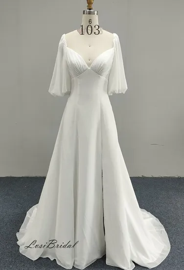 103 Deep V Neckline Chiffon Pleating Wedding Dress with dress bubble Sleeve Bridal Gown Directly Supplied by Manufacturer Bridal Factory