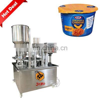 Easy to Opera Automatic Cream Cheese Filling Machine Cheese Cup Filling MachineProducts DescriptionApplicationThe rotary cup machine is fully automatic to container-loading, fill, foil-loading, seal and overlid stackable containers with reliability and accuracy. This cup filling sealing machine is equipped with PLC and touchscreen HMI, gives flexiblity to configure properly for your application. All control functions are adjustable via the menu-driven operator interface. Precision made and built to last, our cup filling and sealing machine combines innvoative features, customized for a perfect fit every time.The mold of this machine can be customized according to product requirements.The machine can be customized for filling sealing packing ice cream, yogurt, milk, soymilk, chilli sauce,juice, honey, ketchup, mineral water etc.Machine InformationHoney spoon filling machineModelJK-250HSJK-320HSPacking speed800~1000 pieces/hour1600~2000 Pieces/hourFilling volume1~20gMachine power220V/380V,50HZ,4KW220V, 50HZMachine size(L*W*H)1217*1015*13431250*1250*1650Machine weight250KG280KGMain Features1. Digital screen display with numerical setting and flexible operation.2. Imported PLC control system and color touching screen, easy operation.3. Imported film driving system and color sensor enable accurate position.4. PID independent control of temperature, more suitable for different packaging material.5. Multiple automatic alarming functions, maximum deduction the loss.6. Dual encoders enable more stable performance.Machine Working ProcessTouch Control ScreenSet the parameters on the screen, such as filling weight, speed, etc.Falling Cup DeviceSpoon drop down one by one automatically.Metering Filling DeviceAutomatically measure the required weight and fill it into the cup.Foil Film Lid StationVacuum arm suck and put foils on cups for cup sealing.Heating sealing deviceAutomatic high temperature sealing, good sealing performance.Automatic Delivery of Finished ProductsGet perfect finished cup.Why Choose UsJIKE BEE MACHINERY has a professional team to provide customers with various packaging solutions. Fully understanding the needs of customers,engineers design the most suitable solution. We have our own processing and assembly workshop and quality inspection and debugging process to ensure the quality of the machine. After acceptance by the customer, they are packed in international standard wooden cases and shipped.Company ProfileFoshan Jike Bee Automation Equipment Co., Ltd. is a manufacturer of automatic packaging equipment.We are a production-oriented enterprises focused on product innovation, factory direct sales and perfect after-sales service in one.The automatic packaging equipment for granule, powder, liquid and sauce produced by the Jason company is at the advanced level of the industry,it can be customized production automatic material packaging line for all kinds of products .Mainly applicable to: food, hardware, drugs, daily chemicals, pesticides, fruits and vegetables, cosmetics, other industries.The company has its own patent and product technical certification, which can bring customers high quality equipment and worthy of customer trust.Customer PhotosOur customers have covered more than 80 countries around the world.And give us unanimous praise.CertificationsFAQQ1:Do you have manual or operation video for us to know more about the machine? Yes, not only manual or operation video, 3D drawing also available to make as per your design,also the video we can make of testing the material from our packaging machine if your packing goods easier for us to find from our local market. Q2:How can I trust you for the first time business ?Please note our above business license and certificate. And if you don't trust us, then we can use Alibaba trade assurance service, guarantee your money, and guarantee your machine's on-time delivery and machine quality.Q3:Is engineer available to serve oversea?Yes, but the travel fee is paid by you. So actually to save your cost, we will send you a video of full details machine installation and assist you till the end.Q4:How can we make sure about the machine quality after we put the order?Before delivery, we will send you the pictures and videos for you to check the quality, and also you can arrange for quality checking by yourself or by your contacts in China.Q5:Will you provides the door to door service?Yes. Please offer us your final destination, we will check with our agent to see if it available, and most of the area is ok for us to clearing and sending in your countries.