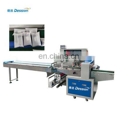 Automatic horizontal plastic foam pearl cotton packing machine foam plastics packing machinery equipmentMachine IntroductionPackaging ApplicationAutomatic flow packing machine is a widely used packing machine. Suitable for all kinds of product packaging. Including medicalsupplies, vegetables and meat, baked bread, snacks and candy, daily necessities, hardware accessories, etc.Packing EffectThe effect after packaging is back-seal bag. According to demand, other devices can be customized or upgraded to meet other models. For example, pillow bag with hole, bag with label, gusset bag, etc.Machine Structure and ParametersMachine Characteristics1. Double frequency conversion control, the bag length canbe set and cut, no need to adjust the air, one step in place, saving time and film.2. Man-machine interface, parameter setting is convenient and quick.3. Fault self-recognize function, fault display at a glance.4. High-sensitivity photoelectric eye color tracking, digital input sealing position, make sealing position more accurate.5. Temperature independent PID control, better suitable for various packaging materials.6. Positioning stop function, no sticky kuife, no waste film.7. The transmission system is simple, the work is more reliable, and maintenance is more convenient.8. All control is implemented by software, which is convenient for function adjustment and technical upgrade, and never lags behind.ModelDS-250XDS-350XDS-450XDS-600XDS-700XDS-800XFilm Width(mm)Max.250Max.350Max.450Max.600Max.700Max.800Bag Length(mm)45~33065~330120~450130~450120~600120~600Bag width(mm)30~11050~16060~21060~28050~33050~380Products Height(mm)Max.70Max.80Max.110Max.150Max.150Packing Speed(bag/min)40~23030~15030~15020~12030~150Machine Power220V / 380V, 50/60HZ,2.4KWMachine Size(L*W*H, mm)3920*670*13204020*720*14503900*900*14683990*1000*14684400*1100*14604400*1200*1460Machine Weight800KG900KG900KG1050KG1050KG1050KGDetails ImagesMachine WorkflowThis machine is easy to operate. Just set the parameters on the screen, and then you can start the machine. Put the product on the conveyor belt, the machine will automatically pull the film, the bag is formed, sealed, and finally the bag is cut.Multilingual touch screenThe machine supports various language customization, easy to operate.High sensitivity eye sensorThe eye sensor automatically senses the color code to ensure accurate and beautiful packaging effects.Replaceable bag formerWhen you want to change the bag width, you only need to change a different size bag fromer.Electronic control componentUse Panasonic PLC and frequency converter to ensure the stable operation of the machine.Related ProductsWhy Choose UsVR1. Professional and Strong TeamDession has a professional team that can provide customers with various packaging solutions. After fully understanding the customer's needs, we provide the most suitable packaging solution to the customer. Then start the production of the machine. We have a strong production and processing capacity, from the customized processing of accessories to the assembly and debugging ofthe machine. Finally, it is packaged and shipped, and it only takes a week to complete.2. Excellent transportation serviceAccording to the needs of customers, we can provide sea transportation, air transportation, and land transportation services, so that you can get the machine as soon as possible. Provide door-to-door transportation services.3. Timely and effective after-sales serviceChoosing us is not only buying a machine, but also our professional and timely service. 1. When the machine is delivered, we will attach a video of the installation and operation of the machine, so that you can use the machine quickly. 2. All electrical appliances of our machines have a one-year warranty, and we will replace them if they fail. 3. When your machine fails, we will have professional engineers to provide professional online after-sales service to help you solve the problem. 4. If the problem cannot be solved online, we will arrange an engineer to repair it on site within a week.Buyer FeedbackWe have 8 years of experience in foreign trade and export, and now our customers have spread to 90 countries all over the world. With our high-quality machines and professional services, we have won unanimous praise from our customers.Company Profile Dession a leading manufacturer of Packaging machine and supporting facilities, which has successfully developed more than 80 kinds of packaging machines. Dession Packaging Machine has widely applied for different fields throughout the world, such as food/ industrial food, medicines, hotel supplies, disposable goods, rubber goods, daily appliances, hardware fittings, sporting goods, toys etc. Dession has more than 8000 square meters of production plants, 5 production workshops and a parts processing workshop, including small vertical machine production workshops, vertical machine production workshops, pillow machine production workshops, cartoning machine production workshop and filling machine production workshop.FAQQ1:Do you have manual or operation video for us to know more about the machine? Yes, not only manual or operation video, 3D drawing also available to make as per your design,also the video we can make of testing the material from our packaging machine if your packing goods easier for us to find from our local market. Q2:How can I trust you for the first time business ?Please note our above business license and certificate. And if you don't trust us, then we can use Alibaba trade assurance service, guarantee your money, and guarantee your machine's on-time delivery and machine quality.Q3:Is engineer available to serve oversea?Yes, but the travel fee is paid by you. So actually to save your cost, we will send you a video of full details machine installation and assist you till the end.Q4:How can we make sure about the machine quality after we put the order?Before delivery, we will send you the pictures and videos for you t