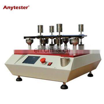 Application HY0401-6 Martindale Abrasion and Pilling Tester is used to determine the abrasion and pilling resistance of all kinds of textile by Martindale method. The circular test specimens are rubbed against the friction surface comprising known abradents at a defined force in the form of a Lissajous figure. Standard ASTM D 4966, D 4970, D3866ISO 12945-2, ISO 12947.1BS 5690, 3424DIN 53863, DIN 53865JIS L1096GB/T4802.2, GB/T21196FZ/T20020IWS Tm196/ TM112 Note: This Martindale Abrasion and Pilling Tester can conform to but not limit to all the standards above, for more standards conformance, please contact us.Features1 6 working positions to test 6 specimens at the same time;2 Microcomputer control, large color touch screen operation;3 With two test method, small and large standard Lissajous curve, small Lissajous mode for pilling test, large Lissajous mode for abrasion test;4 Load pieces and key components made of stainless steel, nice and durable;5 Guide plate made of special aluminum alloy to ensure long time operation without deformation;6 Can preset several running program and several counting mode (increment and decrement)7 Independent cumulative count for each working position;Specification ModelHY0401-6Martindale Abrasion and Pilling TesterWorking position6Specimen diameterdia.140mm (for pilling test)dia.38mm (for abrasion test)Abrading table diameterdia.120mmEffective diameter of abraderA type(1.96N): dia.28.65±0.05mmB type(1.52N): dia.90 ±0.10mmweightsAbrasion testSpecimen holder: 200g±1gLoading piece: 395g±2g, 594g±2gPilling testSpecimen holder: 155g±1gStainless steel disc: 260g±1gTest speed50r±2r/minloading pressure weight for specimen mounting2385g±10gCounting range0~999999times, settablePower supplyAC220V±5%, 50Hz, 500wDimensions885×600×410mmWeight170kg