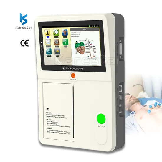 Product Description Hot Sale K-EB63 Touch Screen Medical Electrocardiogram 12 Leads 6 Channel Digital portable ekg Quick Details: 1. Simultaneously acquisition of 12 leads, full screen display of 6 channel ECG waveform. 2. 7'' color touch screen. 3. Built-in rechargeable li-ion battery 4. Automatic measurement, calculation, analysis, waveform freezing. Auto-analyze and auto-diagnostic. 5. Historical data and patient's information can be reviewed and printed. 6. Support USB flash disk & SD memory, stored reports can be saved, opened, analyzed in PC via ECG playback software. 7. Sleep mode to save energy and extend TFT screen life . 8.Lead off & lack off paper detection function. 9.Portable design with hidden handle, convenient to carry. 10.Adapt to 110-230V, 50/ 60Hz AC power supply.