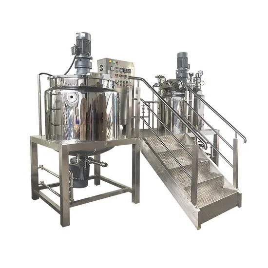 100L Homogeneous vacuum emulsifying mixer machineVacuum emulsifying machine is an ideal option to produce high-grade skin care products, ointment, and many other kinds of creams which need to be very soft and smooth. It has the functions of heating, mixing, scraping, rotating at different speeds and vacuum supply. It has a very wide application from cosmetics (skin cream, hair gel, lotion etc) and food (jam, chocolate, sauces etc.) to ointment, syrup, paste and chemicals(painting, adhesives, detergents) The machine is mainly made up of oil tank, water tank, vacuum homogeneous tank (main tank), heating system, mixing system, vacuum system, electric lifting system, operation control cabinet and piping system.Features:1. Homogenizer is installed on boiler bottom to increase motor power more thoroughly and strongly. It uses advanced German technology, with unique structure. The material moves of high-speed in the multi-gap between the rotor and the stator, which forms a strong hydraulic shearing. During few production, it can exert homogenizing effect fully.