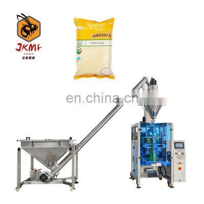 Factory direct sales large vertical powder packaging machine corn wheat flour powder packaging machine accurate detectionProducts DescriptionApplication>What can this machine pack?packaging of materials requiring high accuracy of measurement or careful handling,such as milk powder, sugar powder, coffee powder, wheat flour, detergent powder, coconut powder,spice powder etc.If you need other bag types, we can provide the machine you need, please click to contact me. Machine InformationHigh precision screw measuring machineBag fromer and bag sealing deviceBag cutting deviceThe machine is equipped with inverter, PLC, servo motor, voltage regulator, etc. to ensure the stable operation of the machine.Machine ParametersMachine Host Model320L420L520L620L720L820LFilm Width(mm)Max.320Max.420Max.520Max.620Max.720Max.820Bag Length(mm)80~24080~30080~350150~350100~45080~500Bag Width(mm)50~15060~20080~250200~350100~350180~400Filling Range(ml / g)150~800150~1500150~2000150~4000150~4000150~6000Packaging Speed(bags/min)5~705~6010~505~5010~405~30Machine Powder220V50/60HZ2KW220V50/60HZ2.2KW220V50/60HZ3KW220V50/60HZ3KW220V50/60HZ3.6KW220V50/60HZ3.6KWMain Features1)Imported PLC full computer control system, color touch screen, easy to operate, intuitive and efficient.2)Impoted servo film transport system, imported color code sensor, accurate positioning, excellent overall performance and beautiful packaging.3)A variety of automatic alarm protection functions to minimize losser.4)Flat cutting, pattern cutting, linking cutting can be realized by changing the tools;easy operation with smooth bags.5)Bag-making equipment can be changed according to specific requirement of customers and products.6)Optional English or other languages screen display, easy and simple operation. Both packaging speed and bag length can be set with one click.7)All machines have CE certification and ROSH certificate.Optional DevicesDepending on your needs, you can choose to add the following configuration. Such as thermal transfer coding machine, linking bag device, gas-filled device, easy tearing device, gusseting device and hole device.Machine Working Process1st step: Setting the parameters you want by touch screen.2nd step: The screw measuring machine automatically measures and fills according to the set parameters.3rd step: The motor automatically pulls the film quickly, and the date printer prints the date at the same time.4th step: The bag former will make the bag automatically.5th step: The horizontal and vertical cutter device will seal the middle and of the bag.6th step: You will get the nicely paper or plastic bag type.Why Choose UsJIKE BEE MACHINERY has a professional team to provide customers with various packaging solutions. Fully understanding the needs of customers,engineers design the most suitable solution. We have our own processing and assembly workshop and quality inspection and debugging process to ensure the quality of the machine. After acceptance by the customer, they are packed in international standard wooden cases and shipped.Company ProfileFoshan Jike Bee Automation Equipment Co., Ltd. is a manufacturer of automatic packaging equipment.We are a production-oriented enterprises focused on product innovation, factory direct sales and perfect after-sales service in one.The automatic packaging equipment for granule, powder, liquid and sauce produced by the Jason company is at the advanced level of the industry,it can be customized production automatic material packaging line for all kinds of products .Mainly applicable to: food, hardware, drugs, daily chemicals, pesticides, fruits and vegetables, cosmetics, other industries.The company has its own patent and product technical certification, which can bring customers high quality equipment and worthy of customer trust.Customer PhotosOur customers have covered more than 80 countries around the world.And give us unanimous praise.CertificationsFAQQ1:Do you have manual or operation video for us to know more about the machine? Yes, not only manual or operation video, 3D drawing also available to make as per your design,also the video we can make of testing the material from our packaging machine if your packing goods easier for us to find from our local market. Q2:How can I trust you for the first time business ?Please note our above business license and certificate. And if you don't trust us, then we can use Alibaba trade assurance service, guarantee your money, and guarantee your machine's on-time delivery and machine quality.Q3:Is engineer available to serve oversea?Yes, but the travel fee is paid by you. So actually to save your cost, we will send you a video of full details machine installation and assist you till the end.Q4:How can we make sure about the machine quality after we put the order?Before delivery, we will send you the pictures and videos for you to check the quality, and also you can arrange for quality checking by yourself or by your contacts in China.Q5:Will you provides the door to door service?Yes. Please offer us your final destination, we will check with our agent to see if it available, and most of the area is ok for us to clearing and sending in your countries.