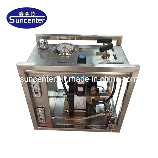 To operate this system, the pressure gauges, valves and pressure regulators have to be fitted on panels. The outlet pressure is easily to be set through a simple air regulator. The pump stops automatically when this end pressure is reached and restarts with a slight drop in the outlet pressure or an increase in the air drive pressure. SUNCENTER Hydraulic power packs are available with wide range of pressure ratios make these series of pumps ideal for powering a variety of oil/hydraulic operations. The maximum operating pressure up to 640 MPa.