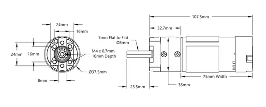 7203 series planetary gear motors can provide your robot with smooth, efficient and powerful power. The end face has 6 M4 screw mounting holes, and the mounting holes adopt the standard Zhouyu robot hole pattern, which greatly facilitates fixing the motor to other Zhouyu robot parts. The 8-mm hexagonal shaft output shaft is supported by double roller bearings, which allows the motor to handle huge torque loads and improve efficiency. The diameter of the gearbox reaches 36mm, fix the gearbox on the motor with screws from the side. This fixing method helps the gearbox to have super resistance to loosening. Although the gearbox itself is larger, the clever design of the head shape leaves more room for nearby components. The relative quadrature encoder is capable of running at 3.3V and 5V. Motor size RS-555 motor type, brushed DC nominal voltage 12VDC output shaft 8mm, hexagonal shaft, 24mm long, gearbox style, planetary, gear ratio 1:1/3.7:1/5.2:1/13.7:1/19.2:1/26.9:1/50.9:1/71.2:1/99.5:1/139:1/188:1/ gear material, steel, no-load speed @ 12VDC 6000 rpm, no-load current @ 12VDC 0.25A locked-rotor current @ 12VDC 9.2A stall torque @ 12VDC 1.47 kgs. Centimeters (20.45 Oz inches) Wire length 470mm (including Connector) wire gauge 16AWG motor connector type 3.5mm FH-MC bullet connector, encoder connector type 4-Pos JST XH [FH-MC] encoder type, relative, orthogonal, encoder sensor type, magnetic (Hall effect) encoder voltage range 3.3 - 5VDC encoder resolution, 28 PPR on output shaft on output shaft, weight 396g