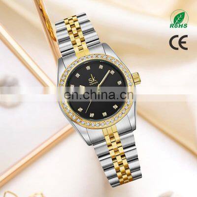 SHENGKE K0156L SK Golden Watch Dial Diamond Pointer Stainless Steel Folded Band Quartz Watches Luxury SaatModel NumberK0156LBrandSHENGKEStlyeWoman Luxury WatchMovement CITIZEN(2035)Case MaterialAlloyDiameter/Thickness33mm/10mmBand MaterialAlloyBand Width17mmWaterproof3ATMBattery Life18 Months1. What's your MOQ? Can I mix styles and colors?A: Take our brand logo watches for wholesale is no MOQ limited , but if customized your logo (OEM ), the MOQ is :Alloy case watch 300pcs/style,can mix 2~3 colors ,stainless steel case watch 500pcs/per style .can mix 3~5 colors 2. Can we print our own logo?A: Yes,we can print your logo or design on the band, dial, buckle, back, case and other place, usually the color of the logo is one color.3.What about the warranty?A: 12 months movement warranty, and we are very confident with our products, and we will pack it very well, so usually you will receive your goods in good condition. But to avoid any subsequent trouble regarding quality issue, we suggest you check the watches once you receive them, and let us know if there is any damaged ones, so that we can deal with it accordingly.4.Do you offer Drop shipping (Blind shipping )?Yes , we offer Drop shipping/Blind shipping,we haven enough experience in drop shipping ,every day we have many watches to send out many countries for drop shipping.5. Do you do custom watch boxes?Yes, we do custom watch boxes. We can follow your requirement to make the boxes ,or you can select our boxes with your logo.6. What movement do you usually use in your watches?We usually use Japanese movement ,Swiss movement, and Chinese movement, for example Seiko,Citizen,Miyota,Ronda ,Kingstar we use most.7.What is your packaging?1.Not over 5 pcs order  ,each watch will be put into a bubble bag then packaging well into a safe white bag(as below picture)2.Over 20 pcs order ,each watch will be put into a opp bag, then put into a bubble bag,  after that all total put into a white box.(as below picture)For OEM/ ODM Products packaging:Normal packaging 1.Each piece will be put into a poly bag;2.20 pieces into a white box;3.10 white boxes into a 39*30*33cm carton;  Special packaging: As per your request.