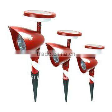 Product Description 12-PC IN COUNTER DISPLAY OF SNOWFLAKE SOLAR SPOTLIGHT Solar powered, save money and energy Durable plastic construction in candy cane stripes with snowflakes, waterproof No wiring required, easy to assemble and install Ground stake included Auto on/off switch, manual switch optional White, red, amber, green and dual LEDs available Charging time: 8 hrs Operation: Over 8hrs Amorphous solar panel 2V 40mA 1 white LED 1*AA 1.2V/400mA Ni-MH batteries Dimension: 110*90*340mm PDQ: 405*280*260mm/12pcs Packaging:425*300*270mm/12pcs G.W./N.W.: 2.9/1.7kg
