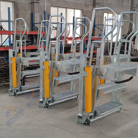 Inspect the tanker for safety and maintenance   Load the tanker by loading arm (what is loading arm?)   Check the load and take samples   Wash or decontaminate compartment    Folding Stairs Features:         Fully balanced self-leveling steps to automatically adjust to varying tanker heights    Full galvanized treatment, anti-corrosion, rust-proof and durable    Safety handrails and knee guards fitted as standard    Hinged safety step to protect against accidentally trapping toes    Pull-rope to assist returning stairs to 'parked' position    Vertical locking device (optionally offset) for 'parked' position with foot-pedal release    Extended outboard step to provide additional area and stability, for stepping onto the tanker top    Rubber bumper to prevent sparking and reduce risk of tanker damage          Typical Models of Zhanxing Folding Stairs: