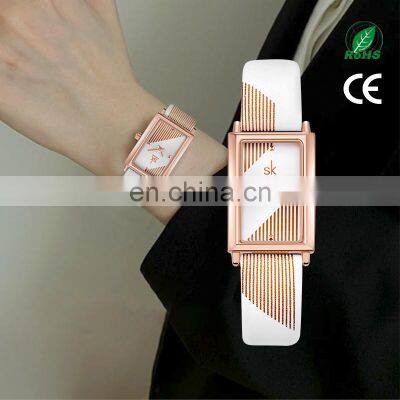Shengke SK White Leather Women Watch K0165L Luxury Female Quartz Wristwatches Ladies New Arrival Fashion Clock Relogio Feminino Model NumberK0165LBrandSHENGKE(SK)StlyeLady Fashion WatchMovement CITIZEN(2035)Case MaterialAlloyDiameter/Thickness19.5*27.0mm/6.5mmBand MaterialPU LeatherBand Width14mmWaterproof3ATMBattery Life18 Months1. What's your MOQ? Can I mix styles and colors?A: Take our brand logo watches for wholesale is no MOQ limited , but if customized your logo (OEM ), the MOQ is :Alloy case watch 300pcs/style,can mix 2~3 colors ,stainless steel case watch 500pcs/per style .can mix 3~5 colors 2. Can we print our own logo?A: Yes,we can print your logo or design on the band, dial, buckle, back, case and other place, usually the color of the logo is one color.3.What about the warranty?A: 12 months movement warranty, and we are very confident with our products, and we will pack it very well, so usually you will receive your goods in good condition. But to avoid any subsequent trouble regarding quality issue, we suggest you check the watches once you receive them, and let us know if there is any damaged ones, so that we can deal with it accordingly.4.Do you offer Drop shipping (Blind shipping )?Yes , we offer Drop shipping/Blind shipping,we haven enough experience in drop shipping ,every day we have many watches to send out many countries for drop shipping.5. Do you do custom watch boxes?Yes, we do custom watch boxes. We can follow your requirement to make the boxes ,or you can select our boxes with your logo.6. What movement do you usually use in your watches?We usually use Japanese movement ,Swiss movement, and Chinese movement, for example Seiko,Citizen,Miyota,Ronda ,Kingstar we use most.7.What is your packaging?1.Not over 5 pcs order  ,each watch will be put into a bubble bag then packaging well into a safe white bag(as below picture)2.Over 20 pcs order ,each watch will be put into a opp bag, then put into a bubble bag,  after that all total put into a white box.(as below picture)For OEM/ ODM Products packaging:Normal packaging 1.Each piece will be put into a poly bag;2.20 pieces into a white box;3.10 white boxes into a 39*30*33cm carton;  Special packaging: As per your request. Note: Only Normal packaging service is free.