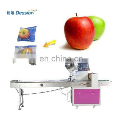 Automatic fresh fruit packing machine apple pillow packing machine priceMachine IntroductionPackaging ApplicationAutomatic flow packing machine is a widely used packing machine. Suitable for all kinds of product packaging. Including medicalsupplies, vegetables and meat, baked bread, snacks and candy, daily necessities, hardware accessories, etc.Packing EffectThe effect after packaging is back-seal bag. According to demand, other devices can be customized or upgraded to meet other models. For example, pillow bag with hole, bag with label, gusset bag, etc.Machine Structure and ParametersMachine Characteristics1. Double frequency conversion control, the bag length canbe set and cut, no need to adjust the air, one step in place, saving time and film.2. Man-machine interface, parameter setting is convenient and quick.3. Fault self-recognize function, fault display at a glance.4. High-sensitivity photoelectric eye color tracking, digital input sealing position, make sealing position more accurate.5. Temperature independent PID control, better suitable for various packaging materials.6. Positioning stop function, no sticky kuife, no waste film.7. The transmission system is simple, the work is more reliable, and maintenance is more convenient.8. All control is implemented by software, which is convenient for function adjustment and technical upgrade, and never lags behind.ModelDS-250XDS-350XDS-450XDS-600XDS-700XDS-800XFilm Width(mm)Max.250Max.350Max.450Max.600Max.700Max.800Bag Length(mm)45~33065~330120~450130~450120~600120~600Bag width(mm)30~11050~16060~21060~28050~33050~380Products Height(mm)Max.70Max.80Max.110Max.150Max.150Packing Speed(bag/min)40~23030~15030~15020~12030~150Machine Power220V / 380V, 50/60HZ,2.4KWMachine Size(L*W*H, mm)3920*670*13204020*720*14503900*900*14683990*1000*14684400*1100*14604400*1200*1460Machine Weight800KG900KG900KG1050KG1050KG1050KGDetails ImagesMachine WorkflowThis machine is easy to operate. Just set the parameters on the screen, and then you can start the machine. Put the product on the conveyor belt, the machine will automatically pull the film, the bag is formed, sealed, and finally the bag is cut.Multilingual touch screenThe machine supports various language customization, easy to operate.High sensitivity eye sensorThe eye sensor automatically senses the color code to ensure accurate and beautiful packaging effects.Replaceable bag formerWhen you want to change the bag width, you only need to change a different size bag fromer.Electronic control componentUse Panasonic PLC and frequency converter to ensure the stable operation of the machine.Related ProductsWhy Choose UsVR1. Professional and Strong TeamDession has a professional team that can provide customers with various packaging solutions. After fully understanding the customer's needs, we provide the most suitable packaging solution to the customer. Then start the production of the machine. We have a strong production and processing capacity, from the customized processing of accessories to the assembly and debugging ofthe machine. Finally, it is packaged and shipped, and it only takes a week to complete.2. Excellent transportation serviceAccording to the needs of customers, we can provide sea transportation, air transportation, and land transportation services, so that you can get the machine as soon as possible. Provide door-to-door transportation services.3. Timely and effective after-sales serviceChoosing us is not only buying a machine, but also our professional and timely service. 1. When the machine is delivered, we will attach a video of the installation and operation of the machine, so that you can use the machine quickly. 2. All electrical appliances of our machines have a one-year warranty, and we will replace them if they fail. 3. When your machine fails, we will have professional engineers to provide professional online after-sales service to help you solve the problem. 4. If the problem cannot be solved online, we will arrange an engineer to repair it on site within a week.Buyer FeedbackWe have 8 years of experience in foreign trade and export, and now our customers have spread to 90 countries all over the world. With our high-quality machines and professional services, we have won unanimous praise from our customers.Company Profile Dession a leading manufacturer of Packaging machine and supporting facilities, which has successfully developed more than 80 kinds of packaging machines. Dession Packaging Machine has widely applied for different fields throughout the world, such as food/ industrial food, medicines, hotel supplies, disposable goods, rubber goods, daily appliances, hardware fittings, sporting goods, toys etc. Dession has more than 8000 square meters of production plants, 5 production workshops and a parts processing workshop, including small vertical machine production workshops, vertical machine production workshops, pillow machine production workshops, cartoning machine production workshop and filling machine production workshop.FAQQ1:Do you have manual or operation video for us to know more about the machine? Yes, not only manual or operation video, 3D drawing also available to make as per your design,also the video we can make of testing the material from our packaging machine if your packing goods easier for us to find from our local market. Q2:How can I trust you for the first time business ?Please note our above business license and certificate. And if you don't trust us, then we can use Alibaba trade assurance service, guarantee your money, and guarantee your machine's on-time delivery and machine quality.Q3:Is engineer available to serve oversea?Yes, but the travel fee is paid by you. So actually to save your cost, we will send you a video of full details machine installation and assist you till the end.Q4:How can we make sure about the machine quality after we put the order?Before delivery, we will send you the pictures and videos for you to check the quality, and also yo