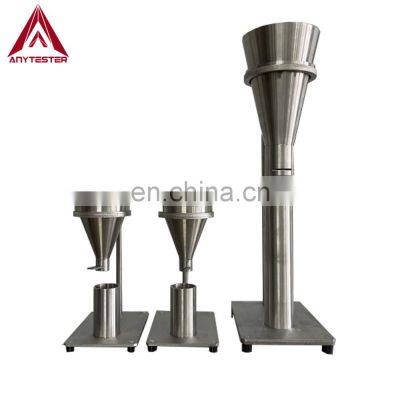 Product DescriptionAT303 Series Apparent Density Tester is used to measure of apparent density, bulk factor, and where applicable, the pourability of plastic materials such as molding powders. The apparatus consists of a measuring cup and a funnel.StandardASTM D1895ISO 60GB/T 1636, 20022, 13173Note: For more standards, please contact usSpecificationModelAT303AAT303BAT303CAT303DVolume of measuring cup100ml±0.5ml500ml±0.5mlSampling quantity110~120ml510~550ml Funnel 1Dia. of upper mouth56mm91mm56mm108mmDia. of lower mouth33mm10mm33mm40mm Funnel 2Dia. of upper mouth//91mm112mmDia. of lower mouth//10mm60mmOur CompanyHistorySince 1982 with more than 20 years’ experienceWarrantyTwo Year Warranty for whole productTrainingVideo and user manual for trainingOnsite serviceInstallation and training service is availableTesting serviceFree sample testing before order is availableLead time15 working days lead time for most productPacking & DeliveryPackagingPackaging Details1. The equipment is covered with film is protect it from water vapour during the trip. 2. The box is filled with foam to protect the equipment from impact. 3. Exported wooden box made from plywood, don't need fumigated. PaymentPayment TermT/TEXW30% T/T in advance, paid the balance before shipmentFOBCFR(C&F)30% T/T in advance, paid the balance against copy of B/LCIFL/CL/C amount above 50,000 usd, we can accept L/C at sightWest UnionAmount lower than 5000usdWest UnionDelivery Time7~10days after receiving payment for one containerContacting Us