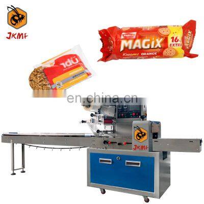 Easy To Opera Automatic Small Round Cookies Packing Machine For Chocolate Sandwich Cookie Packing MachineMachine IntroductionThe JKMF flow packing machine features quick, easy changeover and adjustment that minimizes product and film waste and reduces maintenance costs.The machine working starts with a cylindrical roll of film. The flow wrapping machine will transfer the film from the roll and through to the forming collar (sometimes referred to as tube or plow). At the same time, a conveyor has lined up individual products for wrapping. The film is fed through the collar and the product is surrounded with film, sealed and the film is then cut. The finished individual product is then gathered downstream to be bagged or cartoned prior to boxing and palletizing.This is a flow packing machine specially customized for biscuit. It is suitable for individual packing and tray packing of all kinds of biscuit.Such as square biscuits, round biscuits, sandwich biscuits, waffles, chocolate biscuits, etc.Machine InformationJKMF flow packing machine, a customized model for bread and pastry packing. The packaging speed is fast, the efficiency is high, the packaging process is clean and hygienic, and the operation is simple. Choose the right packaging equipment for your operation and get the highest levels of safety, shelf life, flavor retention, and appearance at every stage of production.The process of automatic bag making, date coding, labeling, weighing, and packaging is completed at one time.ModelJK-250BJK-350BJK-450BJK-600BFilm WidthMax.250 mmMax.350 mmMax.450 mmMax.600 mmBag Length65~330 mm65~330 mm120~450 mm130~600 mmBag Width30~110 mm50~160 mm60~210 mm60~280 mmProduct HeightMax. 40/55 mmMax. 45/80 mmMax. 110 mmMax. 110 mmPacking Speed40~230 bags/min40~230 bags/min30~180 bags/min20~150 bags/minMachine Size(mm)3700*670*14503770*720*14503990*900*14683990*1000*1468Machine Weight450KG500KG550KG800KGMachine Voltage220V, 50/60 HzMachine Power2.4KW2.8KW3.2KW4KWMain Features1.Dual frequency conversion control, Bag length can be set and cut in one step, saving time and film.2.Interface features easy and quick setting and operation.3.Self failure diagnosis, clear failure display.4.High sensitivity photoelectric eye color tracing, numerical input of cutting sealing position for extra accuracy.5.Temperature independent PID control, more suitable for packaging different materials.6.Positioned stop function, without sticking knife or wasting film.7.Simple driving system, reliable working, convenient maintenance.8.All control is realized through software, easy for function adjusting and technical upgrade.Machine DetailsMachine Control CenterThe packaging parameters setting is set on the HMI screen (human machine interface). A pulse is generated for machine movement, and this is transferred to the PLC (programmable logic controller).Including packaging size, packaging speed, etc. Film Holder With Date PrinterWhen the HFFS packaging machine is operating, the film is usually pulled off the roll by film transport belts, which are positioned to the side of the forming tube which is located at the front of the machine. A date printer can be installed on the film holder, so that the production date and other information can be printed on the colleague of the packaging.Replaceable Bag FormerThe film enters a forming tube assembly. As it crests the shoulder (collar) on the forming tube, it is folded around the tube so that the end result is a length of film with the two outer edges of the film overlapping each other. Middle Bag Heat Sealing DeviceThe horizontal seal bar, which is hot, moves forward and makes contact with the horizontal overlap on the film, bonding the layers of film together.Bag Heat Sealing Cutting DeviceA set of heated horizontal sealing jaws come together to make the top seal of one bag and the bottom seal of the next bag. While the sealing jaws are closed, the product that is being packaged is dropped down the middle of the hollow forming tube and filled into the bag.This is a complete packaging process, you will get the perfect packaging finished product.If your product needs to be filled with nitrogen to ensure the freshness of the product, then you need to purchase a set of nitrogen production equipment. In addition, our machines can also be equipped with labeling machines, date coding machines, etc. to meet your production needs.Why Choose UsJIKE BEE MACHINERY has a professional team to provide customers with various packaging solutions. Fully understanding the needs of customers,engineers design the most suitable solution. We have our own processing and assembly workshop and quality inspection and debugging process to ensure the quality of the machine. After acceptance by the customer, they are packed in international standard wooden cases and shipped.The machine has more than 10 advanced patented technologies, CE certificate, ISO9001 certification, etc.We will package the machine's instruction manual and a USB flash drive with machine operation videos together with the machine.Ensure that you can use the machine as soon as you receive it. If you have something you don't understand, our after-sales team will also help you answer in time.Our customers have covered more than 80 countries around the world.And give us unanimous praise.Company ProfileFoshan Jike Bee Automation Equipment Co., Ltd. is a manufacturer of automatic packaging equipment.We are a production-oriented enterprises focused on product innovation, factory direct sales and perfect after-sales service in one. Mainly applicable to: food, hardware, drugs, daily chemicals, pesticides, fruits and vegetables, cosmetics, other industries.The company has its own patent and product technical certification, which can bring customers high quality equipment and worthy of customer trust.FAQQ1:Do you have manual or operation video for us to know more about the machine?Yes, not only manual or operation video, 3D drawing also available to make a