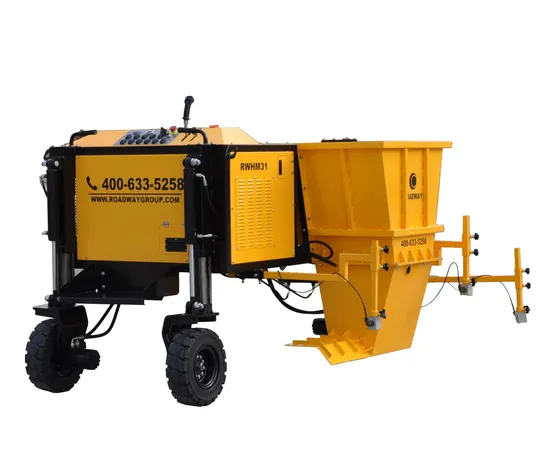 Automatic Curb Paver RWHM31 With HONDA gasoline engine With imported hydraulic variable plunger pump Integrated micro computer control panel, easy operation Forward, Reverse and Steering all controlled by control lever, easy operation With hydraulic rod, high frequency and strong power With high sensitivity tilt sensor, to control direction With imported U.S.A Eaton driving motor With hydraulic high pressure washing pump, can clean machine any time With imported Germany DEUTSCH connectors, waterproof and dustproof