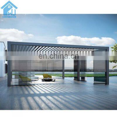 Product DescriptionOur this aluminum pergola is 100% water proof with internal gutter .We can do electric and manual control.The post size of our this aluminum pergola is 150x150x3mm which is very strong to hold the top louver roof system .We can custom any sizes for the aluminum pergola and you can choose motorized and manual control way.As we have our own color cutsomized work shop , we can custom any colors base on RAL color card .For the other accessories like side curtains/blind , LED lights ,heater ,wind/rain sensor , fan and so on , we cal also provide. And we can provide very detailed installation videos, so don't worry about the installation .Welcome to contact and inquiry .Product Name:Aluminium Garden PergolaFramework Main Beam:Extruded from 6063 Solid and Robust Aluminum ConstructionRianfall intensity :0.04-0.05L/S/M2Snow Load:UP to 120kg/m2Win Resistance:UP to 120km/h for closed bladesWidth Range:2.5m - 13.5mElectric Motor's Voltage:110V Or 230VRemote Control:1 Channel or 5 ChannelGutter:Complete with Gutter and Rain Spout for Inbuilt PVC DownpipeLouvres Blade Size:150mm /200mm/ 265mm Aerofoil Type Available, Waterproof Eeffictive DesignPivot Bolt:Highly Durable Aluminum with PP Blade End CapsOther Componentries:Heavy-duty internal fittings, Plastic bush, SS Grade Stainless Steel ScrewsTypical Finishes:Durable Powdercoated for Exterior ApplicationColors Options:We have our own color customized factory , we can custom any colors for youMotor Certification:TUV,CE,SGSHow the water come out : Our aluminum pergola with internal gutter system , the rain/water will come out from the bottom of post,like below picture .ProjectFactory and Package5 Stars review :FAQQ1:How to guarantee the quality of the products?We have our own QC team to control the products quality for all our clients'orders before loading.Q2:How long does it take to install a louvres roof /pergola?It depends on te skills,help and tools, usual 2-3 workers will finish the installation 50m 2 in one day.Q3:It is the louvre roof /pergola rain proof?Yes,the normal weather cnditions,even heavily rain,the roof /pergola will not let in rain.Q4:How does the rain sensor work?The control system normally programmed to close the louvres when rain is detected.Q5:Are louvres roof/pergola energy efficient?The adjustable louvres blade help to reduce heating and controlling the amountof direct sunlight.Q6:Can the louvres roof/pergola used next to the sea?All accessories in aluminium alloy,stainless steel and brass to avoid any rust and corrosion.Q7:How we do business?Take care of your prducts and serve your needs.Contact us by E-mail or by phone. Other Main Products