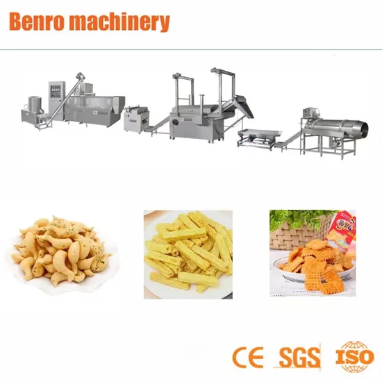 This process line uses double screw extruding technique to replace the traditional steam boiling process. It includes mixing,cooking,extruding and shaping process,no needing boiler,with simple process,high efficiency and little pollution.The raw materials can be rice powder, corn powder,wheat flour individually or their mixture. only by changing the moulds, shaping or cutting machine, the shapes can be various;likes sticks,square sheet rib chips,diamond chips,wavy chips,pillow shapes and bugles etc.The capicity has 120~150kg/h, 200kg/h.
