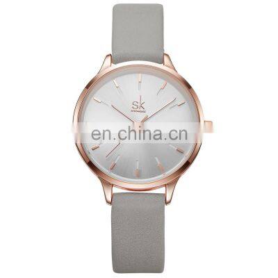 SHENGKE Simple Lady Watch Sun Ray Texture Soft Leather Band Japanese Quartz Movement K8025L Make Your Logo Watches Buyer Feedback FAQ 1.What is your MOQ (MOQ=Minimum Order Quantity)?If you order our brands (SINOBI / SK) watches which we have in stock, no MOQ limited, you can buy how many you want, and can mix with different models and different colors.For OEM or ODM order with brand your logo, the MOQ depends on the case material: ally case watches MOQ is 300pcs , stainless steel case watches MOQ is 500pcs 2.Can you provide sample first before I place mass production order?Yes, we can provide samples for your reference, and the sample fee will be returned to you when you order mess bulk products which reaches minimum order quantity 300~500 pieces3.How about your products quality?Our quality had praised so many clients , quality advantage as below :1)All our SINOBI and Shengke (SK) watches are at least 3ATM water resistant, 100% tested by Waterproof Testing Machine.2)All our brands’ watches are vacuum plated,color would last at least 1~2 years.3)For OEM or ODM watches, we will produce the watches as your requirements. It can comply with CE&RoHS, etc. You can arrange your QC team or hire the third party to test the watches before delivery.4.How long is your warranty time?All our Sinobi and Shengke (SK ) brands watches’ is 12 months warranty. 5.What's the delivery time?If take our brand logo watches, the delivery 3~7 days after paymentFor OEM orders, the delivery time is : alloy case watches 20~25 days , stainless steel case watches 45~50 days .6.How about shipping methods?If you have a courier in China, goods can be sent to your courier after payment.If you have no cooperated courier, we will check the shipping details and cost for you after your final order is confirmed.7.Are you factory or trade company?We are factory (in Guangzhou ,China),welcome to visit our factory, if you are interested in our factory ,please contact us for more details.8.How to place an order?Click below picture to contact with us for more information