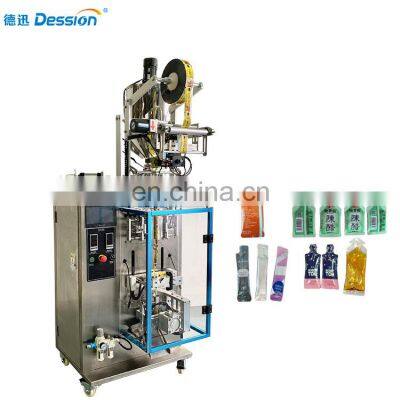 DS-200YX liquid irregular sachet packing machine for honey cosmeticProduct DescriptionDession liquid packing machine is suitable for the packaging of various liquid and sauces, such as soup,edible oil,liquid medicine,cream,seasoning sauce,honey,shampoo and shower gel etc.According to customer needs,the bag types can be changed:back seal, three sides seal, four side seal.1. The section where the material contact is stainless steel as the body of machine is optional for complete or partial stainless steel and all out equipments have passed the CE Standard.2. Optional English or other languages screen display, easy and simple operation. 3. High-sensitivity photoelectric color tracing and digital input of cutting position get more accuracy.4. Packaging speed and length of bags can be set to some extent without further adjustment and parts changing packaging speed and length of bags can be set to some extent without further adjustment and parts changing. 5. Bag-making, filling, sealing, cutting, counting can be achieved automatically and straightly. 6. Bag-making equipment can be changed according to specific requirement of customers and products.Model NO.DS-200YMeasuringLiquid Filling PumpBag ShapeBack Sealing / 3 Sides Sealing / 4 Sides SealingPacking Speed30~80 bags/minRoll WidthMax.200mmBag Length30~180 mmBag Width15~100 mmMachine SizeL)640*W)700*H)1580mmMachine Weight300kgPower220V,50HZ,1.2KVAEasy Control Touch ScreenLanguage: Standard English and Chinese. Any language can be customized.PLC: Imported PLC microcomputer with interface and frequency control enables bag parameter setting more convenient and easier. Film RollerThe film can be replaced easily on the film roller.Various films adaptable: OPP/CPP,OPP/CE,MST/PE/PET/PE.Liquid Pumpthe filling weight is adjusted,the texture of the machine is #304 stainless steel for the material contact parts.It is safe andmeets with the GMP standard.Bag Former#304 stainless steel bag former is for shaping the film into a bag.Different bag width needs different bag former.Shaped Bag CutterHigh speed of fine and clean cutting and sealing bags.Positioned stop function avoides sticking blades and wasting materials.Different cutter dies can be customized according to customer needs to change the shape of the bagOur CompanyCertificationsPacking & DeliveryPayment1.T/T and Western Union are accepted2.30% deposit before production and 70% balance before shipment3.All banking charges outside China are on buyersShipping1.Upon receipt of payment , delivery date will be in 15-30 working days,2.By Air, by Sea or by Express (DHL etc)3.Shipment cost will depend on the destination, shipment way and the weight of the goodsFAQQ1:Do you have manual or operation video for us to know more about the machine? Yes, not only manual or operation video, 3D drawing also available to make as per your design,also the video we can make of testing the material from our packaging machine if your packing goods easier for us to find from our local market. Q2:How can I trust you for the first time business ?Please note our above business license and certificate. And if you don't trust us, then we can use Alibaba trade assurance service, guarantee your money, and guarantee your machine's on-time delivery and machine quality.Q3:Is engineer available to serve oversea?Yes, but the travel fee is paid by you. So actually to save your cost, we will send you a video of full details machine installation and assist you till the end.Q4:How can we make sure about the machine quality after we put the order?Before delivery, we will send you the pictures and videos for you to check the quality, and also you can arrange for quality checking by yourself or by your contacts in China.Q5:Will you provides the door to door service?Yes. Please offer us your final destination, we will check with our agent to see if it available, and most of the area is ok for us to clearing and sending in your countries.Our Service