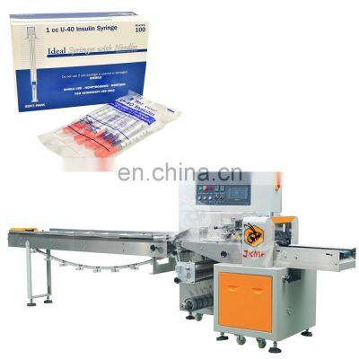 Fashionable Trendy Style Needle Pillow Packing Machine Syringe Packing Machine Insuline Syringe Packing MachineProducts DescriptionAutomatic flow packing machine is a widely used packing machine. Suitable for all kinds of product packaging. Including medical supplies, vegetables and meat, baked bread, snacks and candy, daily necessities, hardware accessories, etc.Machine ParamentersMain Features1.Dual frequency conversion control, Bag length can be set and cut in one step, saving time and film.2.Interface features easy and quick setting and operation.3.Self failure diagnosis, clear failure display.4.High sensitivity photoelectric eye color tracing, numerical input of cutting sealing position for extra accuracy.5.Temperature independent PID control, more suitable for packaging different materials.6.Positioned stop function, without sticking knife or wasting film.7.Simple driving system, reliable working, convenient maintenance.8.All control is realized through software, easy for function adjusting and technical upgrade.ModelJK-250XJK-350XJK-450XJK-600XFilm WidthMax.250 mmMax.350 mmMax.350 mmMax.350 mmPacking SizeL: 45~330 mmW:30~110 mmH:Max.70 mmL: 65~330 mmW:50~160 mmH:Max.80 mmL: 45~330 mmW:30~110 mmH:Max.70 mmL: 45~330 mmW:30~110 mmH:Max.70 mmPacking Speed40~230 bags/min40~230 bags/min30~150 bags/min30~150 bags/minMachine Power220V, 50/60Hz, 2.4KW220V, 50/60Hz, 2.4KW220V, 50/60Hz, 2.6KW220V, 50/60Hz, 2.6KWMachine Size3920*670*1320 mm4020*720*1450 mm3990*900*1468 mm3990*1000*1468 mmMachine Weight800 KG900 KG900 KG1050 KGMachine Working Process1st step: Put the packaging film on the holder and wear the film as required.2nd step: Setting the parameters you want by touch screen.3rd step:Put the materials to be packed on the conveyor belt4th step: The bag former will make the bag automatically.5th step: The horizontal and vertical cutter device will seal the middleand of the bag.6th step: You will get the nicely paper or plastic bag type.Why Choose UsJIKE BEE MACHINERY has a professional team to provide customers with various packaging solutions. Fully understanding the needs of customers,engineers design the most suitable solution. We have our own processing and assembly workshop and quality inspection and debugging process to ensure the quality of the machine. After acceptance by the customer, they are packed in international standard wooden cases and shipped.We will package the machine's instruction manual and a USB flash drive with machine operation videos together with the machine.Ensure that you can use the machine as soon as you receive it. If you have something you don't understand, our after-sales team will also help you answer in time.Our customers have covered more than 80 countries around the world.And give us unanimous praise.Company ProfileFoshan Jike Bee Automation Equipment Co., Ltd. is a manufacturer of automatic packaging equipment.We are a production-oriented enterprises focused on product innovation, factory direct sales and perfect after-sales service in one.The automatic packaging equipment for granule, powder, liquid and sauce produced by the Jason company is at the advanced level of the industry,it can be customized production automatic material packaging line for all kinds of products .Mainly applicable to: food, hardware, drugs, daily chemicals, pesticides, fruits and vegetables, cosmetics, other industries.The company has its own patent and product technical certification, which can bring customers high quality equipment and worthy of customer trust.CertificationsFAQQ1:Do you have manual or operation video for us to know more about the machine? Yes, not only manual or operation video, 3D drawing also available to make as per your design,also the video we can make of testing the material from our packaging machine if your packing goods easier for us to find from our local market. Q2:How can I trust you for the first time business ?Please note our above business license and certificate. And if you don't trust us, then we can use trade assurance service, guarantee your money, and guarantee your machine's on-time delivery and machine quality.Q3:Is engineer available to serve oversea?Yes, but the travel fee is paid by you. So actually to save your cost, we will send you a video of full details machine installation and assist you till the end.Q4:How can we make sure about the machine quality after we put the order?Before delivery, we will send you the pictures and videos for you to check the quality, and also you can arrange for quality checking by yourself or by your contacts in China.Q5:Will you provides the door to door service?Yes. Please offer us your final destination, we will check with our agent to see if it available, and most of the area is ok for us to clearing and sending in your countries.