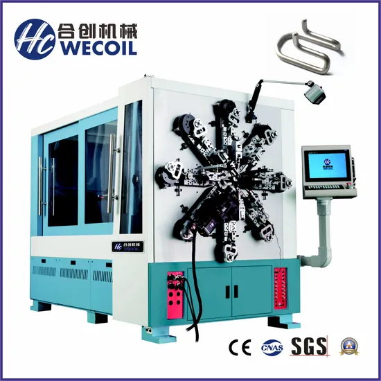 HCT-1245WZ 12 axis Camless CNC Versatile Spring Rotating Forming Machine, is composed by Taiwan computer system and Japan servo motor special designed with no rocker arm and camless, the slide base is separately controlled by eight servo motor, Feeding axis, Quill rotating axis, Wire rotating axis and Spinner axis. It composed of crank connecting link system, feeding and rotating system, coiling straightening system and quill system. It can install the device of hydraulic pressure scissors, low noise; the damage is zero on mandrel and machine. It is suitable for making kinds of tension spring, torsion spring, compression spring, scroll spring, tower spring, flat wire spring and such highly difficult springs. Largely increased the spring making range, it is precise, stable and easy to operate.