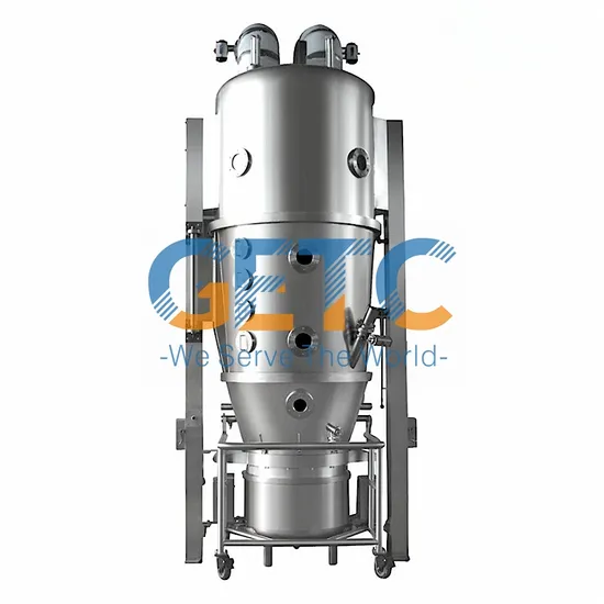 The machine is composed of main machine, air handling system, heating system, slurry handling system and control system. When it works, the materials are fed into the silo of the fluid bed granulator, and after the programs and parameters are set according to the process requirements, the machine starts to work. After filtered by the air handling system and heated by the heating system, the air enters the main machine. After going through the slurry handling system, the slurry is sent to the spray gun and sprayed to the materials inside the cavity, and then is bonded with powder to form granules. After the operation is completed according to the set programs and parameters, the silo is pushed out and connected with the lifting material transferring machine for lifting discharging or the vacuum feeder is used to pump the materials to a high position for granule sizing by the granule sizing machine, so as to effectively control dust pollution and cross contamination.