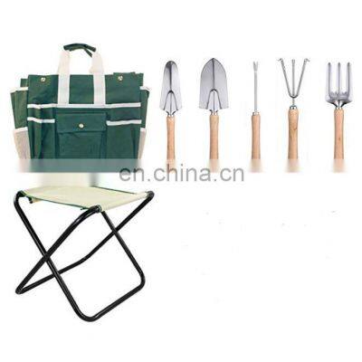 You May LikeProduct DescriptionAll-in-one chair and garden tool set includes: high-quality cast aluminum trowel, grass fork, transplanter, pruning shears, heavy-duty carry bag, and gardening gloves.Lightweight and portable stool, our garden chair set is not only sturdy, but also lightweight, allowing for easy stress-free use around the garden all day long.The high-quality tool set includes bamboo gardening gloves and 4 aluminum hand tools that are made of high-quality aluminum alloy. Ergonomically designed handles reduce pressure on your wrists and hand while digging, weeding, and planting.The best gardening gift for mom and dad. What a great gift idea! This wonderful set of garden bags makes a great gift for any time of the year. Give your loved ones a useful and cute set of gardening tools that they can enjoy in the withering of the year to come.Product DetailsProduct NameGarden Hand ToolsColorGreenMaterialTools-Wood+SS Bag-Cloth Chair-Iron tubeSize46.5 x 42 x 8 cmWeight2000 gramsPacking size48 x 44 x 10 cmPacking weight2.1 kgOEMAcceptedProduct ShowsCompany ProfileOur ServiceExpress Delivery by FedEx, DHL, TNT, UPS, EMS Shipment Weight1 - 45 kg45 - 200 kgor MoreMode of ShipmentBy CourierBy Courier / AirBy Air / SeaLead Time5 - 7 days5 - 7 days5 - 7 days30 days to Europe / USADoor to door delivery carrier includes: DHL, Fedex, UPS, TNT, EMS etc.A full range of sea and air logistics to provide you with the most convenientlogistics experience, rapid response to save your time.Payment TermsTrade AssurancePayPal / Secured PaymentWestern UnionBank TransferFor any amount< $ 5000For any amountFor any amountFrequently Asked QuestionsQ: Why choose us?• Lowest factory price with good quality• Low Minimum Order Quantity • Free sample to check quality• We also accept trade assurance order to protect buyerQ: What kind of method do you use to put customized logo?• Silk screen printing • Laser engraving • Etching• Stamping• Embossing / Debossing and any other mode you wantQ: How to save sample cost?• Stocked item, no MOQ. Small batch production also welcomedQ: How to get a sample?• We can supply free sample of standard product, you just need to bear the shipping cost.• For customized sample, please contact us for sample cost.Q: What is sample time and production?• Existing sample: 2-3 days• Customized sample: 7-10 days• Mass Production Time: 25-30 daysQ: What is your shipment term?• We can send your shipment by Sea / Air / Door to door courier, depends on the shipment size we can give you suggestions.• As we are sending shipments frequently by courier , we are getting good discount from the carrier, and we will transfer the benefit to you.Q: What is your term of payment?• We are quite flexible about payment, we accept T/T, PayPal, Western Union, Trade Assurance, etc.Contact DetailsPhone Number0086-512-68080479 (Ext No.602)Email Idsales@esunrix.comWhatsApp+86 13606131434Skypesunrise-sales3WeChatesunrix