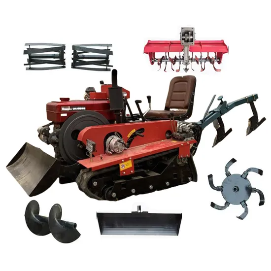 Crawler rotary tiller, the machine comes with five functions as standard: rotary tillage, weeding, trenching, backfilling, and bulldozer. It is compact and powerful; it uses a brand engine with guaranteed quality. It has rear-mounted power output, crawler-type walking, firm grip, not easy to slip, and can turn on the spot, which is particularly suitable for use in narrow spaces. One machine has multiple functions and can be adapted to dozens of agricultural tools, such as grass shredding and returning to the field, strawberry ridging and fertilization, potato harvesting, sowing, double-furrow plow, flip plow, etc.