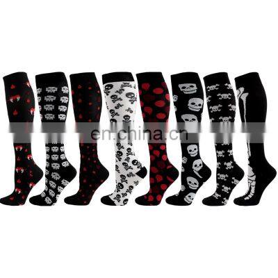 20-30 mmhg Novelty Skeleton Bats Women Men Stocking Pumpkin Alien ET Mummy Pattern Jacquard Spooky Halloween Compression SocksPicture of Halloween Compression Socks Product Description Details description of Halloween Compression Socks 1) Material: polyester/nylon/spandex2) Size: S/M/L/XL Specification of Halloween Compression SocksProduct nameHalloween Compression SocksMaterialpolyester/nylon/spandexNeedle168N, 32S/1*2. 200N availableMOQ10 pairsPacking bulkPaymentTT,paypal,credit card,western union,LCServiceFree mock-ups, fast sample, high quality Detail pictures of Halloween Compression Socks Packaging & Shipping 200pairs/ctnMeas: 50x45x28cmGW/NW:12.0/11.0kg Our Services 1) Your inquiry will be replied within 12 hours.2) Well-trained & experienced sales can reply your inquiries in English.3) Working time: 8:30 am ~6:00 pm, Monday to Friday (UTC+8).During working time, E-mail will be replied to you within 2 hours4) OEM & ODM projects are highly welcomed. We have strong R&D team.5) The order will be produced exactly according to order details and proofed samples. Our QC will submit inspection report before shipment. 6) Your business relationship with us will be confidential to any third party.7) Good after-sale service. Company InformationNingbo Pinbo Plastic Manufacturer is one of most competitive supplier specializes in promotional giftitems, was established in 2006. With more than 160 persons and many modern facilities, currently, wehave already exported to America, Europe, Japan, Mexico and 20 other countries and regions. Your OEMand ODM product are welcome, our 6 experienced engineers and designers can work on your ideas. Weregards “high quality, competitive price, on-time delivery, and fast and effective communications” as ourtenet, hope to cooperate with more customers for mutual development and benefits. FAQ 1) The color can be as per Pantone2) Logo imprint available3) Our partners: