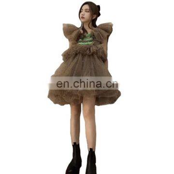 TWOTWINSTYLE Women Dress Slash Neck Butterfly Short Sleeve High Waist Patchwork Ruffle Hit Color Dot Mesh