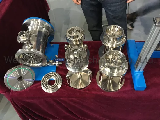 The high-shear emulsifier head adopts a claw and two-way suction structure, which avoids the deadlock angle and whirlpool caused by the difficulty of inhaling the upper material. Under the strong centrifugal force of the high-speed rotating rotor, the material is sheared from the narrow and precise gap between the rotors, so that the material can be quickly dispersed, mixed and emulsified.
