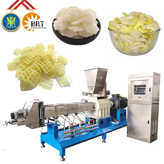 Also can equip with pattern pressing machine and compound machine to produce bugles, net crispy, etc 3D snack pellet. Then by drying, frying and flavoring, the snack pellet can be made to be crispy, vivid instant-eat twice extrusion puffed food. Combinations of unit screw and precise control of processing, that achieve higher quality and various products with more chosen for raw material.
