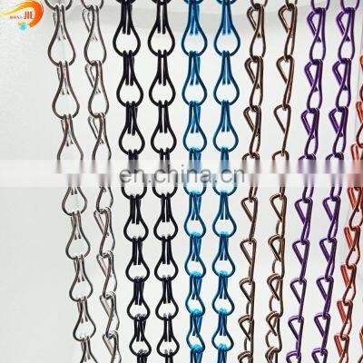 ALUMINUM CHAIN LINK CURTAINCHAIN FLY SCREEN Product DescriptionChain link curtain, also named chain fly screen, is made from aluminum wire with anodized surface treatment. As we all know, aluminum material is lightweight, recyclable, durability and has flexible structure. This ensures chain link curtain has excellent rust resistance and good fire prevention properties. Decorative chain link curtain offers certain protection in addition to the good decorative effects. At the same time, chain fly screen can avoid insects and keep fresh air in which give you a clean environment. In addition, it is available in various colors, you can choose any color according to your architecture style. Due to these advantages, double hook decorative chain curtain is suitable for residences, hotels, restaurants, shopping center and other places. Aluminum Chain Link Curtain SpecificationMaterial:100% aluminum materialWire diameter: 0.8mm, 1.0mm, 1.2mm, 1.3mm, 1.6mm, 1.8mm, 2.0mm, etc.Hook width:9mm or 12mmHook length:17mm, 20.4mm, 22.5mm, 24mm and so on.Curtain size: 0.8m * 2m, 0.9m * 1.8m, 0.9m * 2m, 1m* 2m, 1m*2.1m, etc.Surface treatment:anodizedColors:silver, black, green, blue, red, purple, golden, copper, bronze and any other colors can be customized FEATUREColorful, sagging good, flexible.Dignified and generous, good stereoscopic effectAnti-corrosion, fireproof, good shaded effectsHigh temperature resistance, no fadingExtensive use, remarkable decoration effectVarious shapes and sizes are availableEnvironmental protection, long service life Product ImagesChain link curtain colors Applications Chain fly curtains can be used as: Door curtainWindow curtainStage curtain wallRoom dividerWall ceilingLamp shadeInterior partitionArchitecture outside designs Chain link curtain is widely used for: ResidencesHotelsShopsRestaurantsStair handrailsShopping mallsUpscale resortsShowroomsKitchenOfficeDiscothequesStage sets Packing & Delivery *Put chain link curtain into a plastic bag, and then packaged plastic bags into cartons in order.*Roll chain fly screen with water-proof paper or plastic film, and packaged chain link curtain rolls in cartons or wooden cases as your requests. Related Products Decorative Chainmail CurtainDecorative Crimped Wire Mesh Decorative Perforated Metal SheetDecorative Metal Coil Curtain Our CompanyMetal curtain afford firmness and stylish decorative effect for indoor and outdoor decoration.Metal curtain is a generic terms of decorative wire mesh curtains and drapes. Dongjie Wire Mesh Co., Ltd main products including woven decorative wire mesh drapery, flexible mesh curtain, spiral link mesh, metal coil drapery, honeycomb decoration mesh, mesh fabric, wired glass, ring & hook chain link curtains and so on. Our decorative mesh curtains and drapes with high strength, colorful, flexible provide multiple choice for your high-grade decoration Why Choose Us1. Professional Over 20 years' experience in wire mesh industry and export more than 70 counries. Dongjie Wire Mesh is the real professional manufacturer.2. Product Quality The quality of product is the key of the survival of enterprise . Dongjie Wire Mesh is a ISO9001:2008 certificated manufacturer.3. Reasonable Price We'll exactly control each producing process to reduce cost for our customers. After clients receiving the quotation, we 'll show you the rational priceand the difference between our products and other suppliers' products.4. Delivery Time We'll make a produciton plan before producinig, and the sales will regularly inform the production schedule and process to the customer.5. Communication English is the basic language and other language also can be understood. All customer's e-mail will replied within 2 hours at working hours and must be replied within 12 hours at non-working hours.6. Customized Personalized, professional service: We can provide different programs according to customer's requirement, thus make customers choose the best and appropriate one. Certificates Cpntact Us