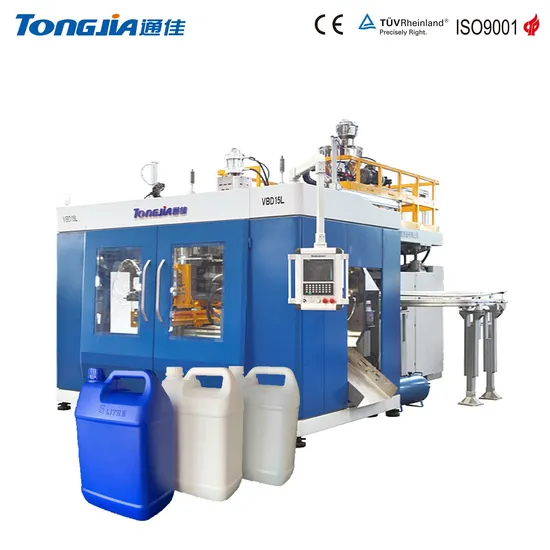 Tongjia TJ-VBD series double-station hollow blow molding machine is mainly composed of safety door,frame, plasticization system, die head lifting device, mold moving and mold opening and closing mechanism,hydraulic system, water cooling system, die head, air blowing Device, tube blank cutting device, pneumatic system, automatic lubrication device, bottle clamping and discharging device, electric control system, etc.