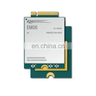 DescriptionKey Features● Supports DFOTA● Supports DTMF● Supports MIMO● USB 2.0 high speed interface● Multi-constellation GNSS receiverOverview● The EM06 is a series of LTE-A Cat 6 IoT modules in an M.2 form factor measuring 42.0mm × 30.0mm × 2.3mm, which meets the 3GPP Release 11 standard. The EM06 delivers maximum downlink rates of 300Mbps and uplink rates of 50Mbps under LTE, and multiple-input multiple-output (MIMO) technology meets demands for data rate and link reliability. The module also supports Qualcomm® IZat™ location technology Gen8C Lite (GPS, GLONASS, BeiDou/Compass, Galileo and QZSS), and the optional multi-constellation GNSS receiver greatly simplifies product design, and provides quicker, more accurate and dependable positioning. The series consists of three variants to meet various geographical demands, which can be compared via the table above.● A wide range of internet protocols, industry-standard interfaces and functionalities (such as USB serial drivers for Windows 7/8/8.1/10, Linux, and Android) allow the module to serve a wide range of IoT applications including industrial routers, home gateways, set top boxes, industrial laptops, consumer laptops, industrial PDAs, rugged tablet PCs, and digital signage.EM06-AEM06-JEM06-EREGION / OPERATORNorth America/ MexicoJapanEMEA/APAC①/BrazilFREQUENCY BANDSLTE-FDDB2/B4/B5/B7/B12/B13/B25/B26/B29②/B30/B66B1/B3/B8/B18/B19/B26/B28B1/B3/B5/B7/B8/B20/B28/B32②LTE-TDDB41B41B38/B40/B412xCAB2+B2/B5/B12/B13/B29②;B4+B4/B5/B12/B13/B29②;B7+B5/B7/B12/B26;B25+B5/B12/B25/B26;B30+B5/B12/B29②;B66+B5/B12/B13/B29②/B66;B41+B41B1+B1/B8/B18/B19/B26/B28;B3+B3/B8/B18/B19/B26/B28;B41+B41B1+B1/B5/B8/B20/B28;B3+B3/B5/B7/B8/B20/B28;B7+B5/B7/B8/B20/B28; B20+B32②;B38+B38; B40+B40; B41+B41WCDMAB2/B4/B5B1/B3/B6/B8/B19B1/B3/B5/B8GNSSGPS/GLONASS/BeiDou (Compass)/Galileo/QZSS (Optional)GPS/GLONASS/BeiDou (Compass)/Galileo/QZSS (Optional)GPS/GLONASS/BeiDou (Compass)/Galileo/QZSS (Optional)DATA TRANSMISSIONLTE-FDD300Mbps (DL)/50Mbps (UL)300Mbps (DL)/50Mbps (UL)300Mbps (DL)/50Mbps (UL)LTE-TDD226Mbps (DL)/28Mbps (UL)226Mbps (DL)/28Mbps (UL)226Mbps (DL)/28Mbps (UL)DC-HSPA+42Mbps (DL)/5.76Mbps (UL)42Mbps (DL)/5.76Mbps (UL)42Mbps (DL)/5.76Mbps (UL)WCDMA384Kbps (DL)/384Kbps (UL)384Kbps (DL)/384Kbps (UL)384Kbps (DL)/384Kbps (UL)CERTIFICATIONSCARRIERNorth America: Verizon/AT&T/SprintJapan: KDDIEurope: Deutsche Telekom*Australia: TelstraREGULATORYGlobal: GCFNorth America: FCC/PTCRBCanada: ICJapan: JATE/TELECGlobal: GCFEurope: CETaiwan (China): NCCAustralia & New Zealand: RCMNorth Africa: ICASAOTHERSRoHS/WHQLRoHS/WHQLRoHS/WHQLEM06-AEM06-JEM06-EWhy Choose UsFAQQ1. What is the minimum order quantity for your products?A1. Minimum order quantity starts from ONE piece.Q2. What's the quality of your products?A2. We have professional QA/QC team to ensure the quality before shipment. We provide 1 year warranty for all the new and original products.Q3. Is this product free of shipping or free samples?A3. Regularly the sample and shipping cost will be at the buyer's account. But in specific case, we may take these costs. Please kindly check with us the details by email. Thank you.All Categories4G 5G ModuleGPS ReceiverGPS AntennaGSM/LTE/WiFi AntennaGSM/LTE+GPS AntennaGNSS/GPS Module2G/3G/4G ModemGPS TrackerRF Cable / ConnectorSIMCard HolderSensorIC