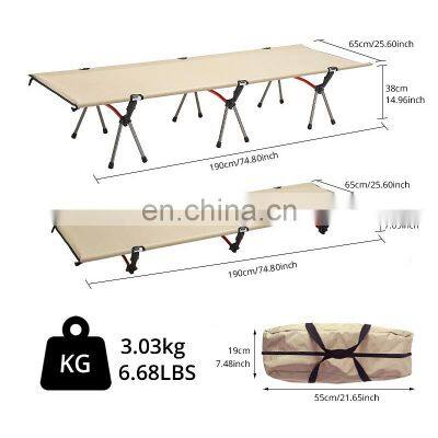 SpecificationitemvaluePlace of OriginChinaProduct NameCamping bedMaterial600D oxford fabric + AL7075 aluminum alloyColorBlack / KhakiLogoAccept Customized LogoMOQ2pcsDimension190 * 65 * 38cmMax. Bearing150kgPackage Size18 * 59cmPackage Weight2.85kgFeaturePortableProduct DescriptionFAQ1. who are we?We are based in Jiangsu, China, start from 2019,sell to South America(15.00%),North America(15.00%),Eastern Asia(10.00%),Eastern Europe(10.00%),Domestic Market(5.00%),South Asia(5.00%),Southern Europe(5.00%),Northern Europe(5.00%),Central America(5.00%),Southeast Asia(5.00%),Western Europe(5.00%),Mid East(5.00%),Oceania(5.00%),Africa(5.00%). There are total about 51-100 people in our office.2. how can we guarantee quality?Always a pre-production sample before mass production;Always final Inspection before shipment;3.what can you buy from us?Bicycle equipment,Outdoor picnic mat,Sporting goods,Japanese dining kitchen and drinking utensils,Household daily necessities4. why should you buy from us not from other suppliers?We cooperate with well-known design companies, product innovation follows the international trend, excellence in quality, and quick response in service. We are not only a supplier of cycling sports outdoor products, but also a solution provider.5. what services can we provide?Accepted Delivery Terms: FOB,FAS,CPT,DEQ,DDP,Express Delivery,DAF;Accepted Payment Currency:USD,EUR,JPY,CAD,CNY;Accepted Payment Type: T/T,L/C,D/P D/A,MoneyGram,PayPal;Language Spoken:English,Chinese,Spanish,Japanese,Portuguese,German