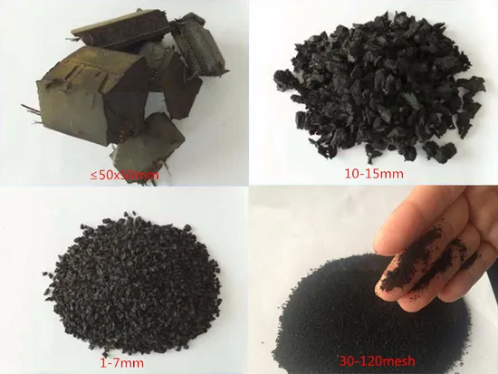 It's used to process whole tires into rubber granules (such as 50*50mm, 10-15mm, 1-7mm...) or ground into rubber powder (such as 20mesh, 30mesh...). Main usages of finished rubber are as follows: refining oil, laying sports track, making asphalt, making waterproof materials, making rubber products, producing reclaimed rubber, etc.