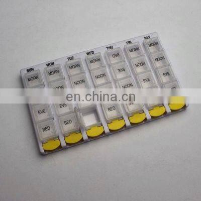 Product Descriptionpill box with lock picutre Details description of pill box with lock :1) 28 compartments for week use2) Food grade3) With lock, safe for child4) PP material5) Printing as per custom Specification of pill box with lock: Model no.PT6070-1Size12.5x21.0x2.4cmMaterialplastic PPUnit weight170.0gColorAs per PantoneCompartments28CertificationFood gradeWay of logo printingSilk sn, stamp printing or heat transfer printing Detail pictures of pill box with lock: Packaging & Shippingpill box with lock packing details:1pc/polybag, 30pcs/inner, 60pcs/ctnCtn size: 46x41x27cmG.W./N.W.:12/10.2kgs Our Services1) Your inquiry will be replied within 12 hours.2) Well-trained & experienced sales can reply your inquiries in English.3) Working time: 8:30 am ~6:00 pm, Monday to Friday (UTC+8).During working time, E-mail will be replied to you within 2 hours4) OEM & ODM projects are highly welcomed. We have strong R&D team.5) The order will be produced exactly according to order details and proofed samples. Our QC will submit inspection report before shipment.6) Your business relationship with us will be confidential to any third party.7) Good after-sale service. Company Information Ningbo Pinbo Plastic Manufacturer is one of most competitive supplier specializes in promotional gift items, was established in 2006. With more than 160 persons and many modern facilities, currently, we have already exported to America, Europe, Japan, Mexico and 20 other countries and regions. Your OEM and ODM product are welcome, our 6 experienced engineers and designers can work on your ideas. We regards “high quality, competitive price, on-time delivery, and fast and effective communications” as our tenet, hope to cooperate with more customers for mutual development and benefits. FAQOur partners: