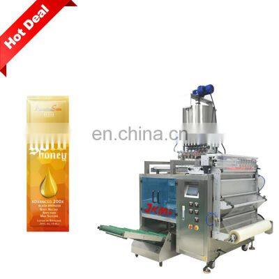 Auto Liquid Packaging Machine / Tomato Ketchup Sauce Sachet Small / Automatic Honey Stick Packing MachineProducts DescriptionApplication>What can this machine pack?Suitable for packing different kinds of product. liquid: honey, ketchup, oil, seasoning sauce, shampoo, juice, etc.Bag TypeMachine InformationModelJK480YJK720YJK960YLane number4~6 lines4~10 lines4~12 linesFilling MethodPiston pump, Peristaltic pumpPacking speedMax. 40 pcs/line/minBag sizeL: 45~120 mm, W: 35~60 mmL: 45~120 mm, W: 35~90 mmL: 45~120 mm, W: 35~120 mmFilm width&ThicknessMax.480mm,0.07-0.10mmMax.720mm,0.07-0.10mmMax.960mm,0.07-0.10mmSealing type4 sides sealingCutting typeStraight cutting, Zig zag cutting, Round cutting, Special cuttingAir&Power0.8Mpa 0.8m3/min; 2.8kw0.8Mpa 0.8m3/min; 4.1kw0.8Mpa 0.8m3/min; 5.5kwDimension&weight950*1470*1750mm; 300kg1153*1654*1750mm; 400kg1415*1686*2130mm; 500kgMain Features1. Multi lanes machine can produce multi lanes bags at same time.2. Machine main function: automatic split film at right position, liquid measuring and filling, multi lanes bag form fill seal, cutting, sensor tracking, counting capacity.3. Other function: Emergency stop, set capacity to auto stop machine, count capacity and Zero the count, ready bag output, manual test machine each step etc.4. Stainless steel contact part and the machine outer shell, high feature for liquid running environment.5. High precision photocell sensor for auto tracking the eye mark printing on the film roll, so cut each bag at precisely position.6. PLC controller, high function and control the whole machine’s work steps.Why Choose UsJIKE BEE MACHINERY has a professional team to provide customers with various packaging solutions. Fully understanding the needs of customers,engineers design the most suitable solution. We have our own processing and assembly workshop and quality inspection and debugging process to ensure the quality of the machine. After acceptance by the customer, they are packed in international standard wooden cases and shipped.Company ProfileFoshan Jike Bee Automation Equipment Co., Ltd. is a manufacturer of automatic packaging equipment.We are a production-oriented enterprises focused on product innovation, factory direct sales and perfect after-sales service in one.The automatic packaging equipment for granule, powder, liquid and sauce produced by the Jason company is at the advanced level of the industry,it can be customized production automatic material packaging line for all kinds of products .Mainly applicable to: food, hardware, drugs, daily chemicals, pesticides, fruits and vegetables, cosmetics, other industries.The company has its own patent and product technical certification, which can bring customers high quality equipment and worthy of customer trust.Customer PhotosOur customers have covered more than 80 countries around the world.And give us unanimous praise.CertificationsFAQQ1:Do you have manual or operation video for us to know more about the machine? Yes, not only manual or operation video, 3D drawing also available to make as per your design,also the video we can make of testing the material from our packaging machine if your packing goods easier for us to find from our local market. Q2:How can I trust you for the first time business ?Please note our above business license and certificate. And if you don't trust us, then we can use Alibaba trade assurance service, guarantee your money, and guarantee your machine's on-time delivery and machine quality.Q3:Is engineer available to serve oversea?Yes, but the travel fee is paid by you. So actually to save your cost, we will send you a video of full details machine installation and assist you till the end.Q4:How can we make sure about the machine quality after we put the order?Before delivery, we will send you the pictures and videos for you to check the quality, and also you can arrange for quality checking by yourself or by your contacts in China.Q5:Will you provides the door to door service?Yes. Please offer us your final destination, we will check with our agent to see if it available, and most of the area is ok for us to clearing and sending in your countries.