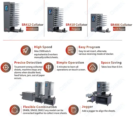 Product Description SR410 is a high speed, easy to operate friction collator with accurate and fast feeding. Simply press the key on the touch screen to start collate hundreds of sets of sheet in minutes. SR410 can be online with DFS series booklet maker forms an in-line bookletmaking system. Meanwhile SR410 can connect any other SR series collator which can be added for up to 22 collating stations.