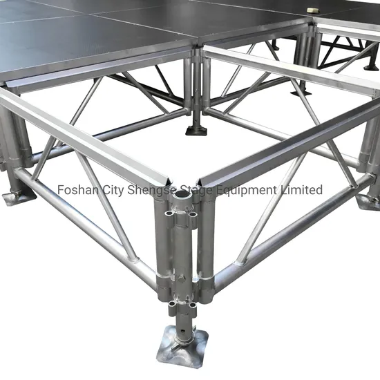Aluminum alloy is the main material used in mobile assemble stage. Aluminum stage are available in different size, Each size of dance stage can be joined with another via a unique built-in platform connector system. The lightweight frame is made from high quality aluminium alloy, 18mm thick slip- resistant laminated plywood and are beard at 750kg per panel.