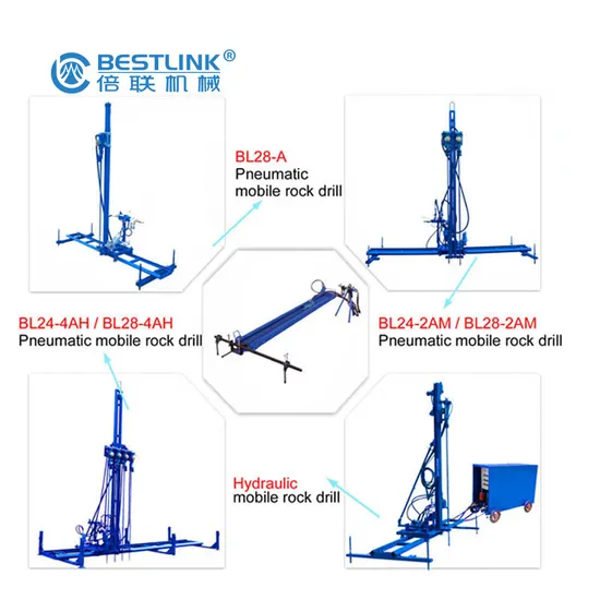 This Pneumatic Line drilling machine (Mobile rock drill), available for horizontal, vertical and slantwise drilling, are mainly used in dimensional stone quarry to divide large blocks into smaller pieces, which is necessary to assist diamond wire saw machine working.