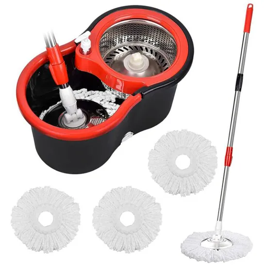 Wide Application-The spinning mop and bucket is wet or dry usage, 360° microfiber spinning mop head easily reaches any difficult corners and gaps without feeling the scrape, with excellent absorption capacity, deep-cleaning microfiber removes and absorbs tough dirt, dust, pet hair, grime, perfect for all types of surfaces, like laminate, hardwood, ceramic, tiles, glass, etc. Microfiber Mop Head is machine-washable and reusable.