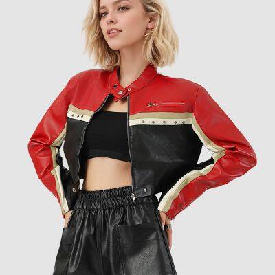 2025 Internet celebrity color blocking splicing PU leather revealing waist cool and handsome women's leather jacket spicy girl motorcycle spot custom printing