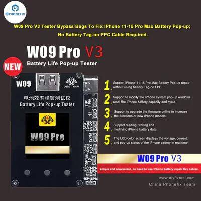 i2C KC02S Battery Repair Tester Modifies iPhone 11-15 Pro Max Battery Health Data Charging Cycles Without Battery Cable. i2C KC02S battery health programmer resets 100% battery capacity and 0 cycle with one-click, removes the iPhone "Important Battery Message" pop-up, no external battery cable required. W09 Pro V3 Tester Repair iPhone "Unknown Parts" Pop-up issue caused by non-genuine battery and reset the iPhone battery health data or cycle.