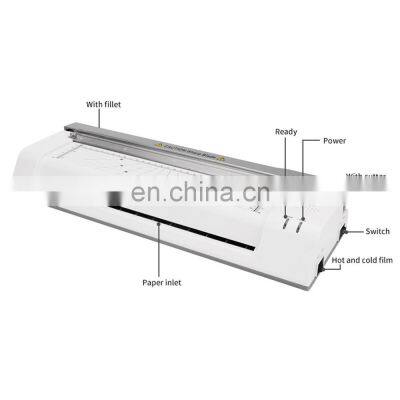 Product DescriptionNew Design Automatic Portable 3 In 1 Lamination Pouches With Paper Cutter And Round Corner Paper Sheet A3 LaminatorProduct NameCold & Hot LaminatorModel NOOL381CBrandWillingMachine MaterialABSApplicationsA3/A4/A5Power365WTemperature control ThermostatHeating materialMicaWarm-up time3-5 minsPouch thickness75-125micMax lamination thickness0.5mmRoller2 rollersLamination speed250mm/minCutter thickness8pcs A4 80g paperTemperature control range 105-138℃Product size435*150*81mm Feature #OL381C1. Jam release.2. Overheating protection.3. COLD / HOT.4. ON / OFF.5. 3 in 1 laminator with paper cutter and round corner. Related ProductsCompany InformationLong-term PartnerCompany PicturesCertificatesExhibition PicturesPackaging & ShippingFAQ