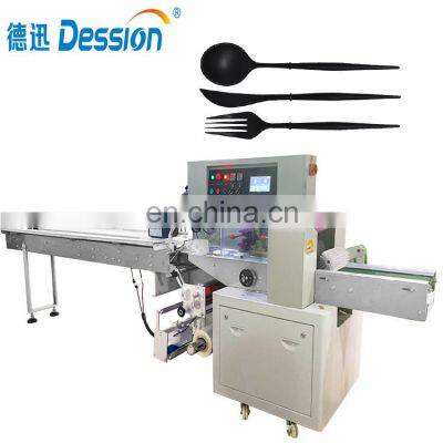 Disposable Chopsticks Spoon Fork Paper Towel Combination Pillow Packaging MachineDession Horizontal Pillow plastic fittings packaging machine widely applied for various kinds of regular objects like food, medicine, daily appliances,cosmetic,metals, industrial parts, boxes, trays, toys and etc.Products Description1.Efficient: Bag-making, filling, sealing, cutting, heating, date / lot number achieved in one time.2.Intelligent: Packing speed and bag length can be set through the screen without part changes.3.Profession: Independent temperature controller with heat balance enables different packing materials; Dual inverters controller, upgradable PLC system, self-failure diagnosis, double encoder. 4.Characteristic: Automatic stop function, with safe operation and saving the film.5.Convenient: Low loss, labor saving, easy for operation and maintenance.6.Adapability: one set of machine can be applicated to different kind of product via optional devices, such as air-filling device, feeding line, etc.ModelDS-250XPackaging Speed40~230 bags/minBag Width30~110 mmBag Length 65~190mm 120~280mmFilm Roll WidthMax.350mmPower220V, 50/60HZ, 2.2KVAOptional DeviceDate Coder / Air-filling Device / Punching DeviceMachine Size(L)3920*(W)670*(H)1320mmEasy Control Touch ScreenLanguage: Standard English and Chinese. Any language can be customized.PLC: Imported PLC microcomputer with interface and frequency control enables bag parameter setting more convenient and easier. SUS304# ConveyorThe whole conveyor is made of 304# stainless steel, qualified for food packaging.Film Roller & High Sensitivity Sensor/ DetectorThe film can be replaced easily on the film roller.Various films adaptable: OPP/CPP,OPP/CE,MST/PE/PET/PE.High sensitivity eye spot detector enables the film positioning more accurate and avoid wasting film or destroying product.Bag Former#304 stainless steel bag former is for shaping the film into a bag.Different bag width needs different bag former.Hot Pressing Middle Sealing DeviceIndependent PID temperature control, heating the double turntable seal, sealing the back of the packaged product, guaranteed sealing.Durable Sealing Cutting BladesHigh speed of fine and clean cutting and sealing bags.Positioned stop function avoides sticking blades and wasting materials.According to customer needs,the bag types can be changed:back seal,stand-up bag and linking bag.Recommend ProductsOur CompanyCertificationsPacking & DeliveryPayment1.T/T and Western Union are accepted2.30% deposit before production and 70% balance before shipment3.All banking charges outside China are on buyersShipping1.Upon receipt of payment , delivery date will be in 15-30 working days,2.By Air, by Sea or by Express (DHL etc)3.Shipment cost will depend on the destination, shipment way and the weight of the goodsFAQQ1:Do you have manual or operation video for us to know more about the machine? Yes, not only manual or operation video, 3D drawing also available to make as per your design,also the video we can make of testing the material from our packaging machine if your packing goods easier for us to find from our local market. Q2:How can I trust you for the first time business ?Please note our above business license and certificate. And if you don't trust us, then we can use Alibaba trade assurance service, guarantee your money, and guarantee your machine's on-time delivery and machine quality.Q3:Is engineer available to serve oversea?Yes, but the travel fee is paid by you. So actually to save your cost, we will send you a video of full details machine installation and assist you till the end.Q4:How can we make sure about the machine quality after we put the order?Before delivery, we will send you the pictures and videos for you to check the quality, and also you can arrange for quality checking by yourself or by your contacts in China.Q5:Will you provides the door to door service?Yes. Please offer us your final destination, we will check with our agent to see if it available, and most of the area is ok for us to clearing and sending in your countries.Why Choose Us