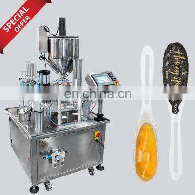 High Speed Automatic Honey Spoon Filling And Sealing MachineProducts DescriptionApplication>What can this machine pack?This liquid fillinging machine is specially designed for making honey spoons, and molds of corresponding sizes can be customized according to customer needs.The outer packaging of honey spoons is also available, such as plastic film outer packaging and box packaging.Machine InformationHoney spoon filling machineModelJK-250HSJK-320HSPacking speed800~1000 pieces/hour1600~2000 Pieces/hourFilling volume1~20gMachine power220V/380V,50HZ,4KW220V, 50HZMachine size(L*W*H)1217*1015*13431250*1250*1650Machine weight250KG280KGMain Features1. Digital screen display with numerical setting and flexible operation.2. Imported PLC control system and color touching screen, easy operation.3. Imported film driving system and color sensor enable accurate position.4. PID independent control of temperature, more suitable for different packaging material.5. Multiple automatic alarming functions, maximum deduction the loss.6. Dual encoders enable more stable performance.Machine Working ProcessMultilingual Central Control ScreenThis machine adopts Delta touch screen, which can be customized in multiple languages. And equipped with independent intelligent temperature control meter. All operations on the machine can be done on the touch screen. easy to use.Automatic Spoon Feeding DeviceFully automatic vibration feeding device, fast conveying, the contact surface is made of food-grade 304 stainless steel, safe and hygienic.Heating Stirring HopperThe large-capacity hopper is specially customized for honey packaging. The interlayer is equipped with an independently controlled heating device and a stirring device to improve the fluidity of honey and ensure accurate measurement.Pneumatic Metering Filling DeviceThe customized high-precision pneumatic metering and filling device has a special retraction device to ensure the accuracy of honey metering and filling. The range of filling can be set on the machine, and the operation is simple.Film Automatic Feeding DeviceThe equipment uses aluminum film film for sealing, which reduces the waste of materials and is more cost-effective than the traditional roll film cutting and sealing type.Spoon Film Heat Sealing DeviceThe honey spoon heat sealing device controlled by the intelligent temperature control system can set the temperature according to the material of the film, and perfectly complete the sealing process of the capsule.Finished Product Automatic Output DeviceAfter the honey spoon is sealed, the spoon is automatically taken out by the suction cup device and placed horizontally on the conveyor belt, and the back end can be replaced with a link packaging device, such as a cartoning machine.Why Choose UsJIKE BEE MACHINERY has a professional team to provide customers with various packaging solutions. Fully understanding the needs of customers,engineers design the most suitable solution. We have our own processing and assembly workshop and quality inspection and debugging process to ensure the quality of the machine. After acceptance by the customer, they are packed in international standard wooden cases and shipped.Our technical team has carefully filmed more than 100 installation and commissioning videos of various accessories and complete machines, providing video training guarantee services for the equipment permanently.We will package the machine's instruction manual and a USB flash drive with machine operation videos together with the machine.Ensure that you can use the machine as soonas you receive it. If you have something you don't understand, our after-sales team will also help you answer in time.Company ProfileFoshan Jike Bee Automation Equipment Co., Ltd. is a manufacturer of automatic packaging equipment.We are a production-oriented enterprises focused on product innovation, factory direct sales and perfect after-sales service in one.The automatic packaging equipment for granule, powder, liquid and sauce produced by the Jason company is at the advanced level of the industry,it can be customized production automatic material packaging line for all kinds of products .Mainly applicable to: food, hardware, drugs, daily chemicals, pesticides, fruits and vegetables, cosmetics, other industries.The company has its own patent and product technical certification, which can bring customers high quality equipment and worthy of customer trust.FAQQ1:Do you have manual or operation video for us to know more about the machine? Yes, not only manual or operation video, 3D drawing also available to make as per your design,also the video we can make of testing the material from our packaging machine if your packing goods easier for us to find from our local market. Q2:How can I trust you for the first time business ?Please note our above business license and certificate. And if you don't trust us, then we can use Alibaba trade assurance service, guarantee your money, and guarantee your machine's on-time delivery and machine quality.Q3:Is engineer available to serve oversea?Yes, but the travel fee is paid by you. So actually to save your cost, we will send you a video of full details machine installation and assist you till the end.Q4:How can we make sure about the machine quality after we put the order?Before delivery, we will send you the pictures and videos for you to check the quality, and also you can arrange for quality checking by yourself or by your contacts in China.Q5:Will you provides the door to door service?Yes. Please offer us your final destination, we will check with our agent to see if it available, and most of the area is ok for us to clearing and sending in your countries.