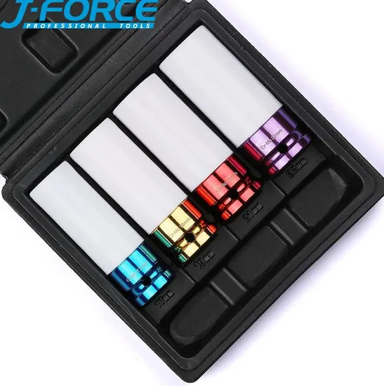 The construction of each 1/2"socket in this 4 piece set consists of extremely strong Chrome- molybdenum (Cr-MO)steel that will output greater torque, but also has a corrosion resistant black phosphate finish to give your sets longevity and longer lifespan. [CR-MO MATERIAL] The wheel protector sockets are made of chrome molybdenum alloy steel, which can withstand high torque than normal cr-v or carbon sockets. CR-MO material possesses high strength and toughness, corrosion resistance, and is not easy to precision forging and heat treatment make the impact sockets durable.[SUPERIOR QUALITY] With a special black electrophoretic paint surface, the rust resistance of the wheel lug nuts socket set is much better than that of ordinary phosphate treated sockets. Color coded and laser etched for easy identification of each size.The color coding doubles as a coating to further improve its corrosion resistance.[WIDE USED] Our set includes 4pcs metric sockets:17mm(blue), 19mm(yellow), 21mm(red),22mm(purple). Safe for use with 1/2" drive socket air and electric impact wrenches, ratchets or torque wrenches. Suitable for factory and aftermarket paint, clear coat, chrome and other wheels/bolts.