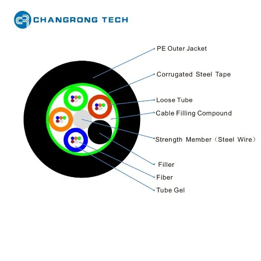 The fibers are positioned in a loose tube made of high modulus plastic and filled with gel. Tubes (and fillers) are stranded around the metallic strength member to form the cable core. The steel tape (CST) is longitudinally armored over the cable core, which is filled with water blocking compound. Finally a PE jacket is extruded.