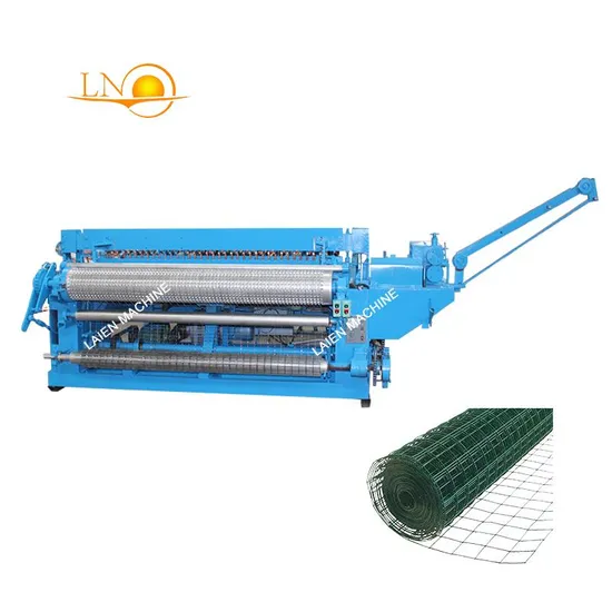 The production line consists of main mesh welding machine, electrical control cabinet, repairing machine, repairing table, bobbin machine, bobbins, bracket for longitude wires, wire pay off stand.